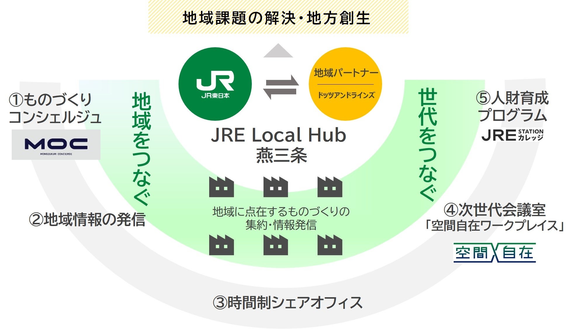 | ○JR東日本は、グループ経営ビジョン「変革2027」において「地方を豊かに」を実現するため、Beyond Stations構想のもと、駅の「地域拠点化」を進めています。このたび、地域の技術や人々をエリアや世代を超えてつなぐ地方創生型ワークプレイス「JRE Local Hub※1」を展開します。 ○1号拠点として、運営パートナー株式会社ドッツアンドラインズ(新潟県三条市、代表取締役社長:齋藤 和也)と共に、燕三条駅構内に「JRE Local Hub 燕三条」を開発します。地域に点在するものづくり拠点を結び、ビジネスマッチングや人財育成を行い産業振興や雇用創出に貢献します。 ○「JRE Local Hub 燕三条」では、ものづくりコンシェルジュ「MOC※2」によるサポートや、遠隔地をつなぐ次世代会議室「空間自在ワークプレイス」による都市部の拠点や教育機関との連携、地域の未来を担う人財育成プログラム「JRE STATIONカレッジ」などを展開します。 |