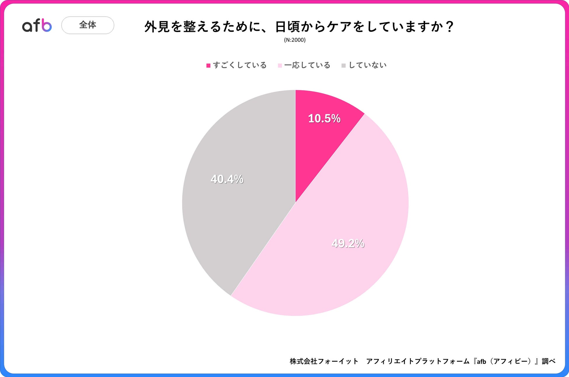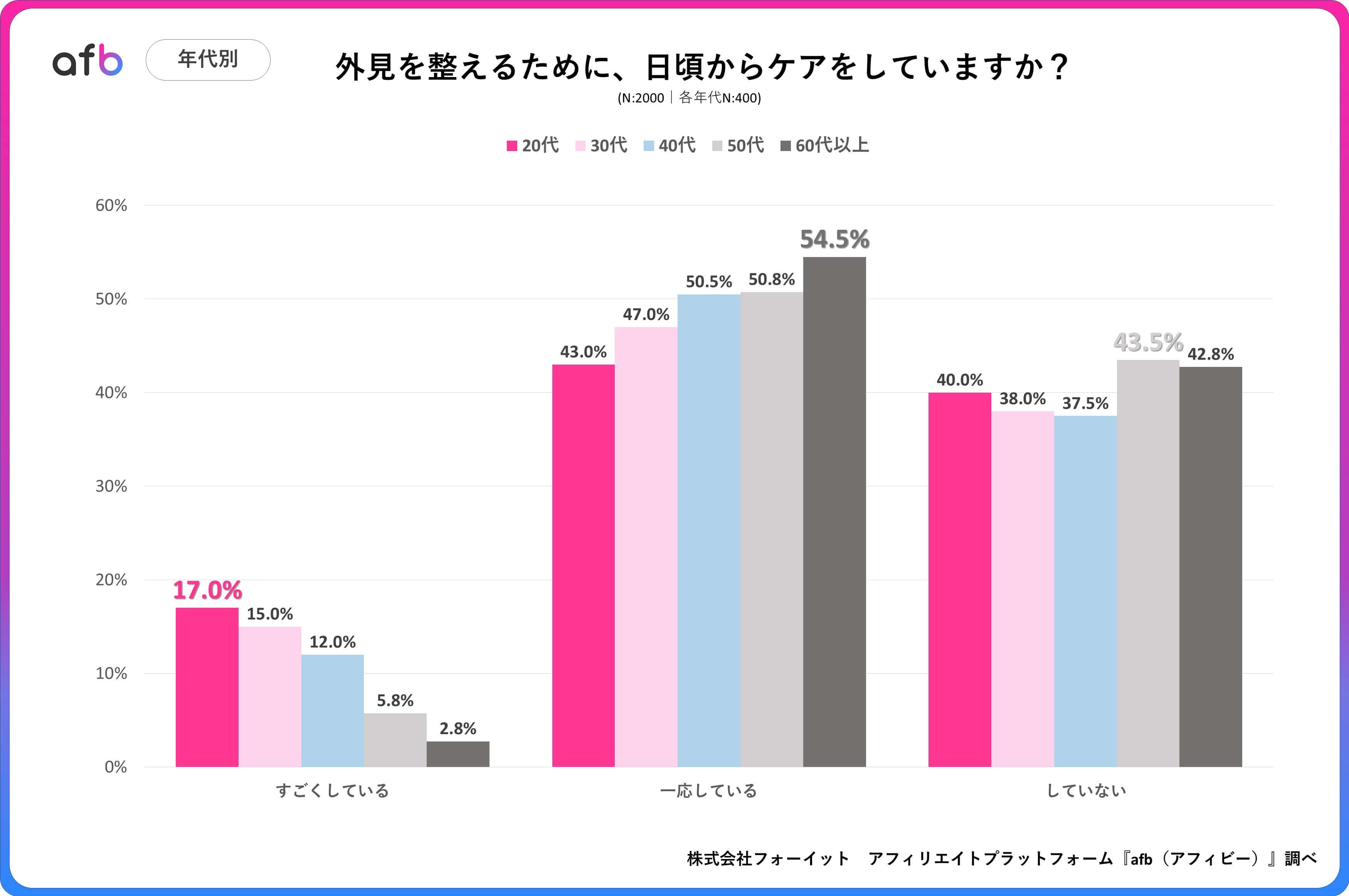 アフィリエイトプラットフォーム「afb(アフィビー)」< https://www.afi-b.com/ >の開発運用をおこなう株式会社フォーイットは、全国の20代~60代までの男女2000人を対象に身だしなみに関するアンケートを実施し、年代別等の特徴についてまとめました。