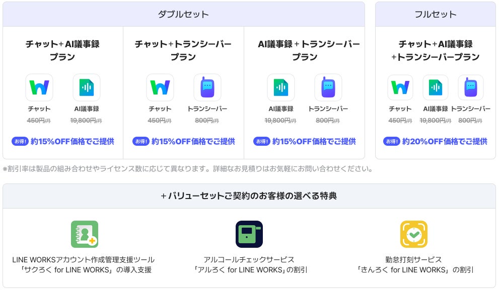建設現場の業務課題を解決できるチャットアプリの「LINE WORKS」、トランシーバーアプリの「LINE WORKSラジャー」、AI議事録アプリの「LINE WORKS AiNote」をお得に使えるセットプランをご提供します(最大20%off)。さらにバリューセットご契約の企業様には、アルコールチェックや勤怠アプリが割引価格で利用できる“選べる特典”もご用意しています。