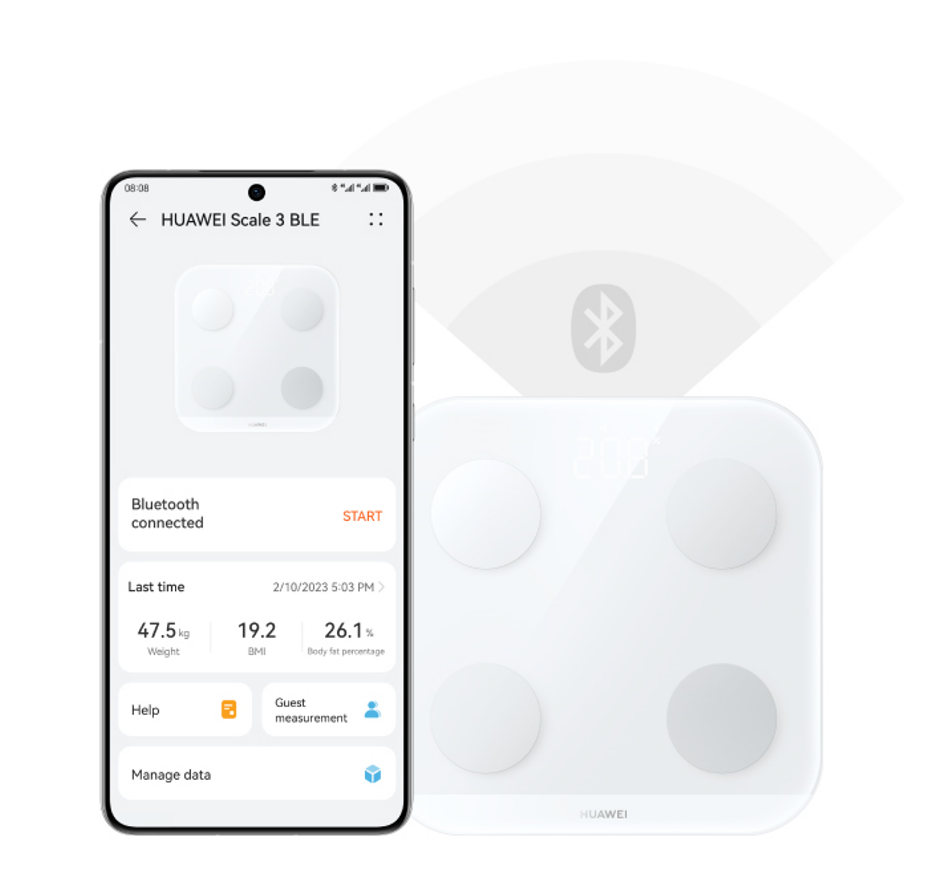 また、体重だけでなく、体脂肪率の測定結果もスケールに直接表示されるため、素早く便利に測定できます。また、HUAWEI Healthアプリと『HUAWEI Scale 3 Bluetooth® Edition』を接続するだけで、データが同期され、い測定結果をアプリから確認できます。