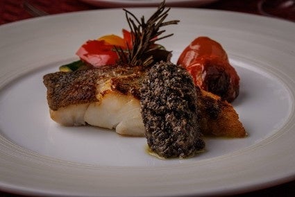 冷涼な海で育まれた青森県産タラを使用した魚料理。素材の良さを活かすため、香り高いハーブとともに丁寧にローストし外は香ばしく中はふっくら焼き上げ、オリーブオイルで仕上げています。オーブンで甘みを凝縮させたプチトマトと彩り豊かな野菜が華やかさを添え、タップナードがお料理全体を引き締めるアクセントになり、コースの後半を印象づける一皿です。