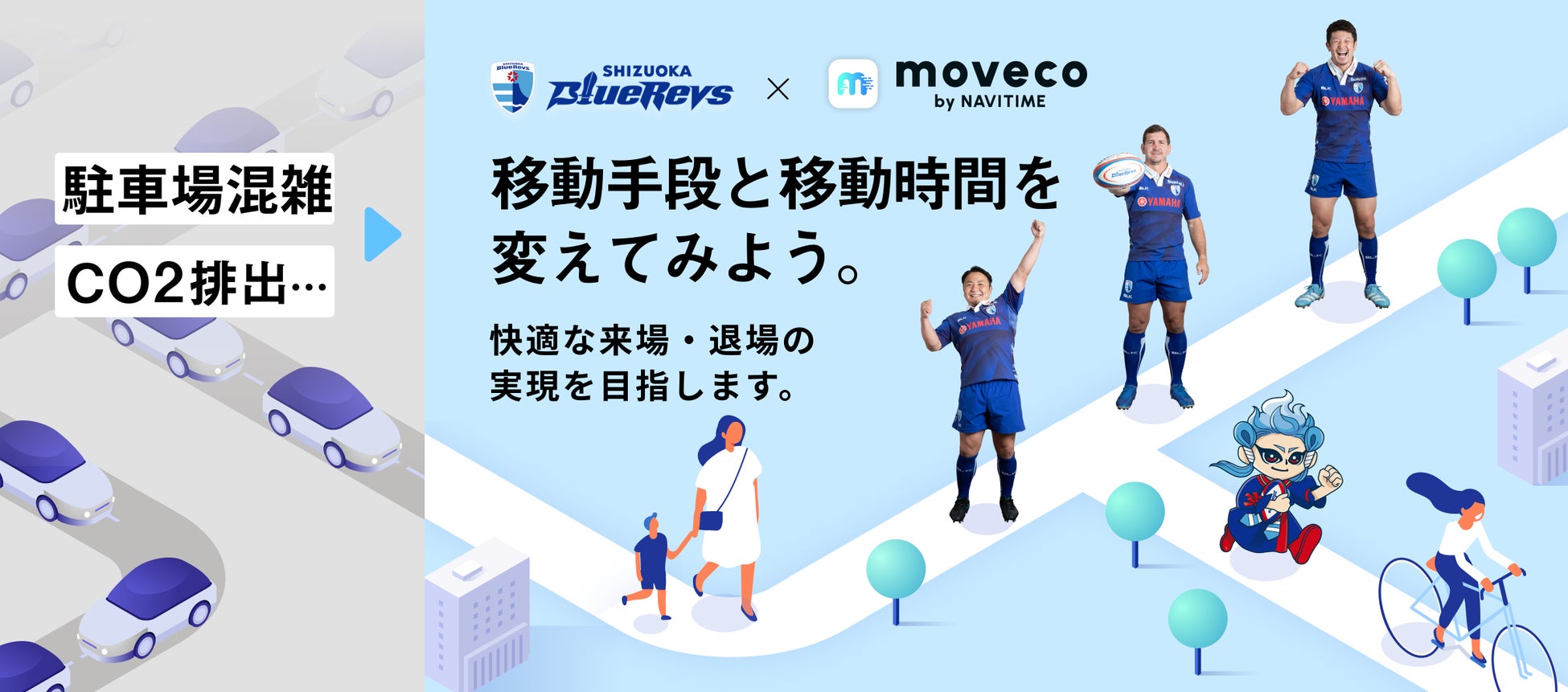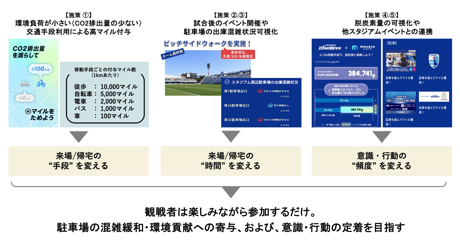 「移動を変えて、おトクに楽しもう」をキーワードに、『moveco by NAVITIME』(以下、「アプリ」という)内に「レヴズモード」を搭載し、自家用車以外の移動手段へのシフトに対するインセンティブの付与や、試合終了後のスタジアム駐車場混雑状況のリアルタイム表示などを実施。さらに、試合後にイベントを開催し、これらにより、周辺道路の渋滞・駐車場内の混雑緩和やCO2排出量の削減を目指します。