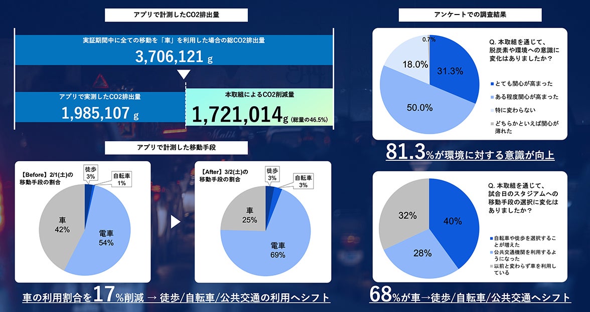また、3月2日の試合日には、スタジアムへの移動手段における車の利用率は、実証実験前の2月1日と比べて約17%削減され、自転車や電車での移動にシフトしたという結果となりました。参加者アンケートにおいても、試合日のスタジアムへの移動手段の選択に変化があったという回答が68%となり、スタジアム来場者の意識変容が見られました。