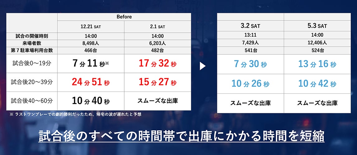 また、試合終了後には、駐車場から一斉に出庫するため、駐車場を出るまでに最大50分を要することもあり、観戦者の満足度低下や、リピート率低下につながる可能性があるとして、解決策を模索していました。