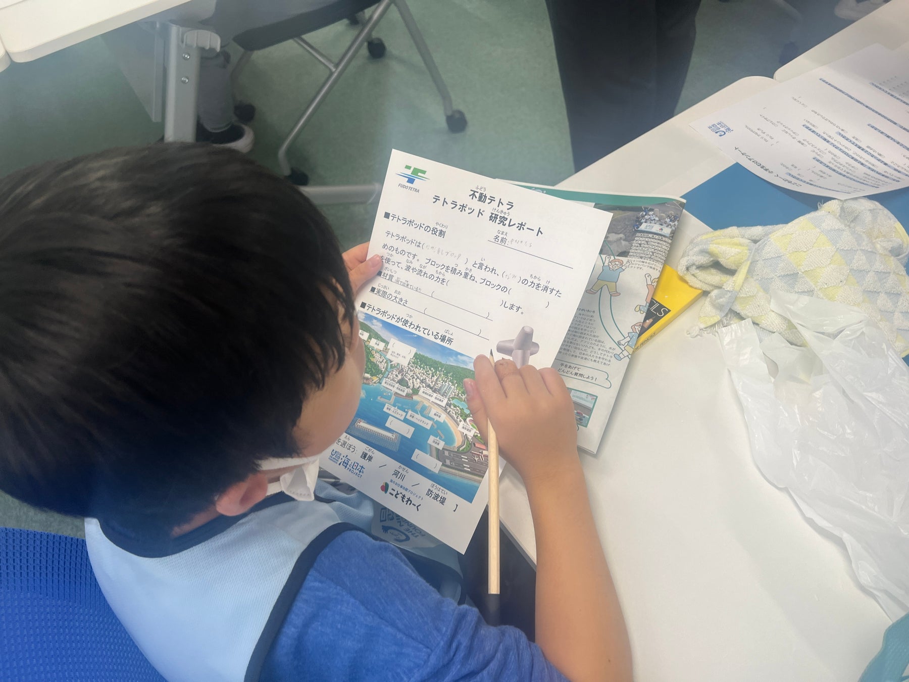 自然環境が変化する中、海に囲まれた日本では災害が日常化し、災害への備えの重要性が増しています。今回も自然災害から国土や私たちの生活を守ってくれる「研究職」の仕事にフォーカスし、子ども達に体験機会を提供しました。海や波・テトラポッドを題材に、キッズ研究員として実験・プレゼンを実践。「研究とは何か?=学び・興味・好奇心を持つことの大切さ」「研究と生活の関連性」を感じることができる内容としました。