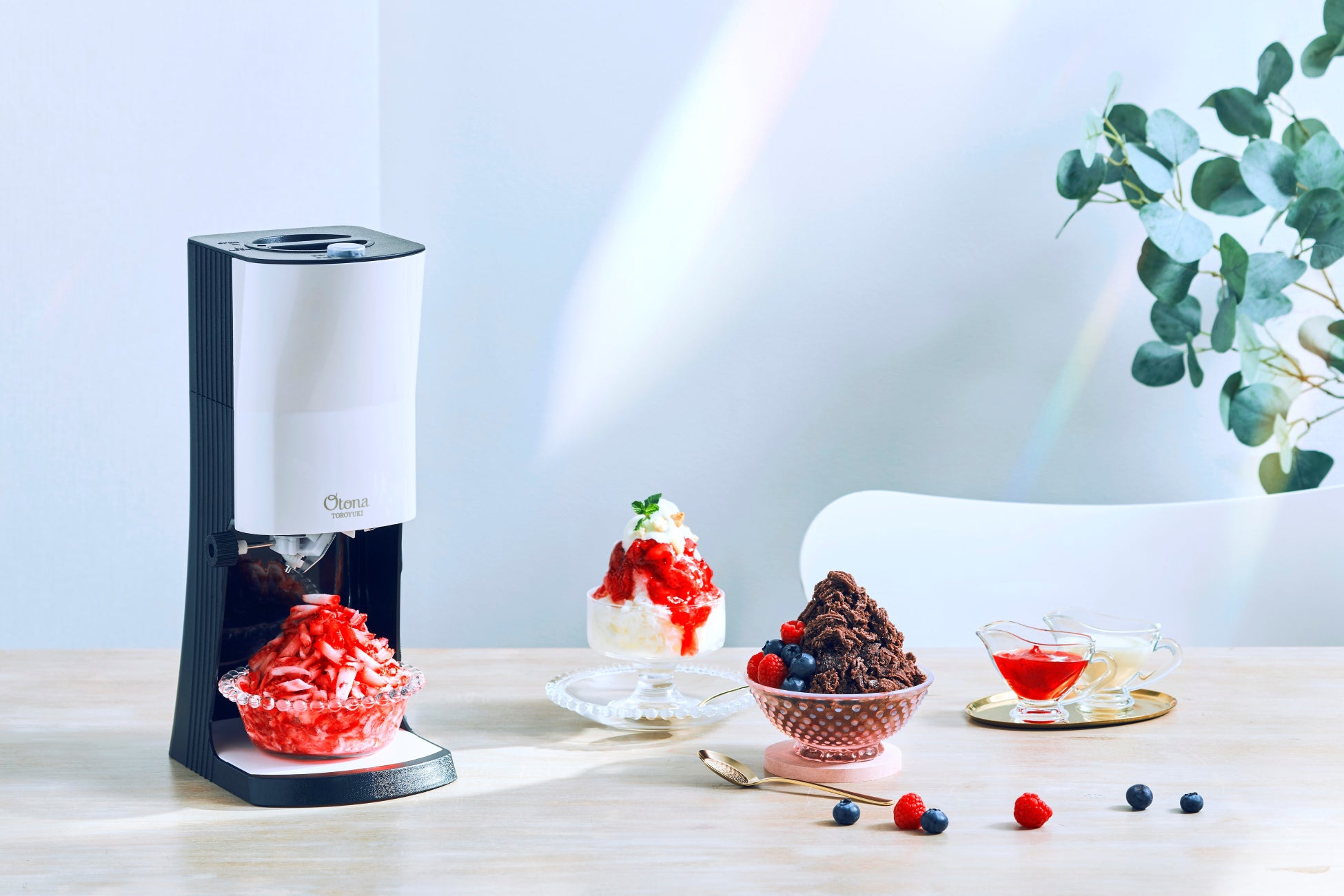 <ふわとろ食感で人気のかき氷器から新たに2機種発売!>器への盛り付けが簡単「電動ふわふわ とろ雪かき氷器プライム」スリムに持って使える「電動ふわふわ とろ雪スティックかき氷器」