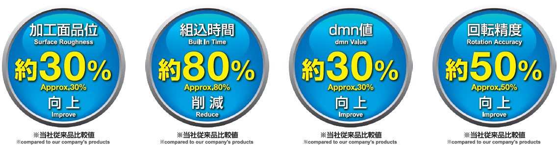 精度について、本気で考えたベアリングです。軸受の5つの基本性能「精度よく回る(高精度)」、「静かに回る(静粛性)」、「速く回る(高速性)」、「軽く回る(低トルク)」、「長く回る(長寿命)」を高い次元で達成します。