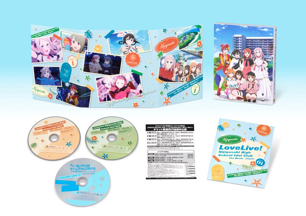 封入特典として「ラブライブ!虹ヶ咲学園スクールアイドル同好会 LIVE&FAN MEETING TOUR ニジガク校外学習 歌おう♪踊ろう♪語ろう♪(福岡・宮城・愛知・北海道公演)」チケット最速先行抽選申込券(※)や、オリジナルソングCD「Poka Poka 日和」、ブックレットが付属します。さらに、矢野妃菜喜(高咲 侑役)ほかニジガクキャストが、映画の舞台となった沖縄のスポットを巡る新規撮り下ろしロケ映像「ゆうさんぽ4~沖縄編~」や、9月8日に丸の内ピカデリーにて開催された豪華キャスト11名登壇の公開記念舞台挨拶映像、PV、CMを収録した特典ディスクも付属します。また、映像特典として週替わり映像(振り返り映像、エンディング映像)が収録されています。