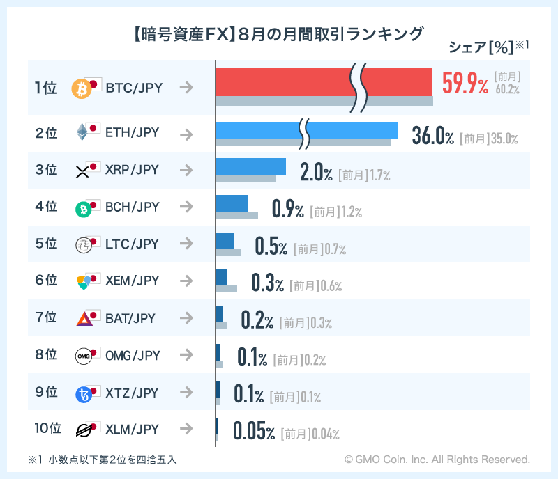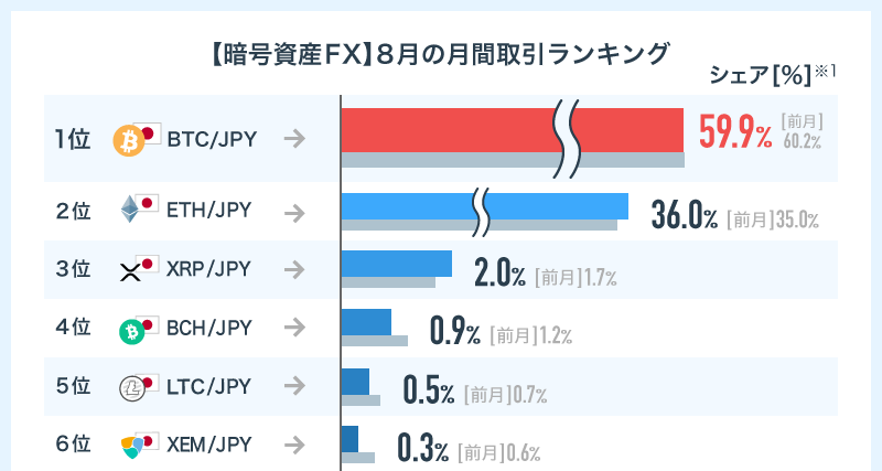 「暗号資産FX」では、ビットコイン(BTC)/JPYがシェア59.9%で1位となりました。