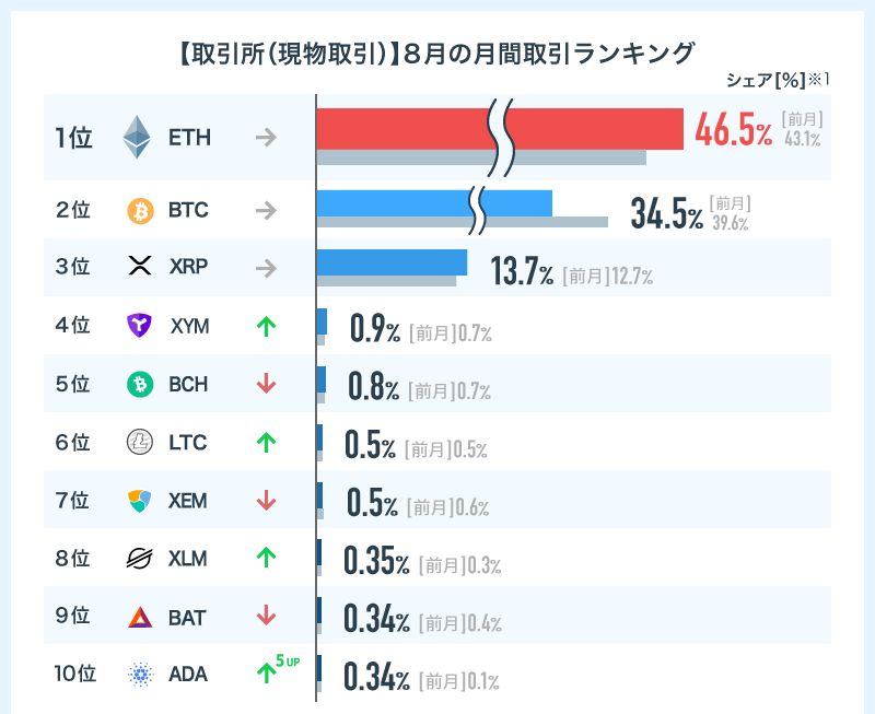 前月7月の取引ランキングと比較すると、上位銘柄ではビットコイン(BTC)、リップル(XRP)がシェアを下げ、イーサリアム(ETH)、ダイ(DAI)、コスモス(ATOM)がシェアを伸ばしました。