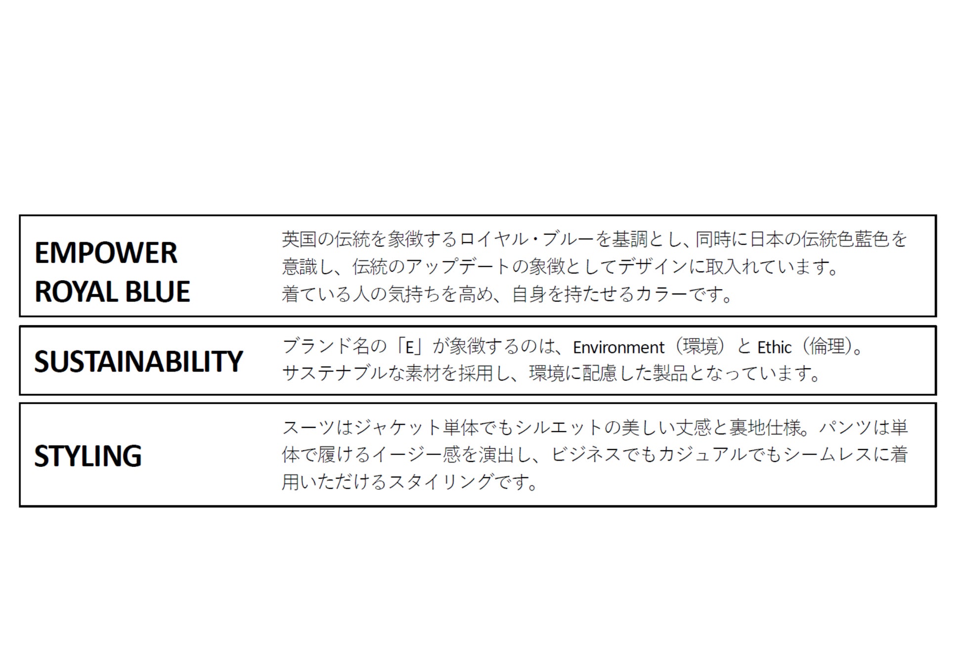 また実用的な機能性を生み出す仕立て、ディテールにまで気を配ったデザインを徹底的に追求し、ビジネスパーソンとその家族の健康に、ファッションを通して貢献できることを目指しています。