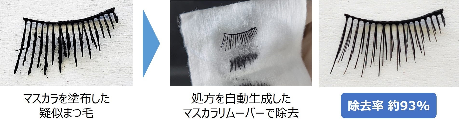 当社が開発した化粧品処方を自動的に生成する処方自動生成システムは、量子コンピュータの高い演算能力を利用しつつ、正しい解を導き出しにくいという課題を従来型コンピュータで補ったハイブリッド型のアルゴリズムとなります。このシステムを用いて、角栓の溶解に特化したクレンジングオイル処方の生成を試みたところ、わずか10秒程度で高い角栓除去能を持つ処方を生成できることを確認しました。さらに、汗や涙で落ちにくいマスカラを簡単に落とすことが出来るマスカラリムーバー処方の生成を試みたところ、強固に付着したマスカラを十分に除去することができる処方を自動生成することができました(図1)。