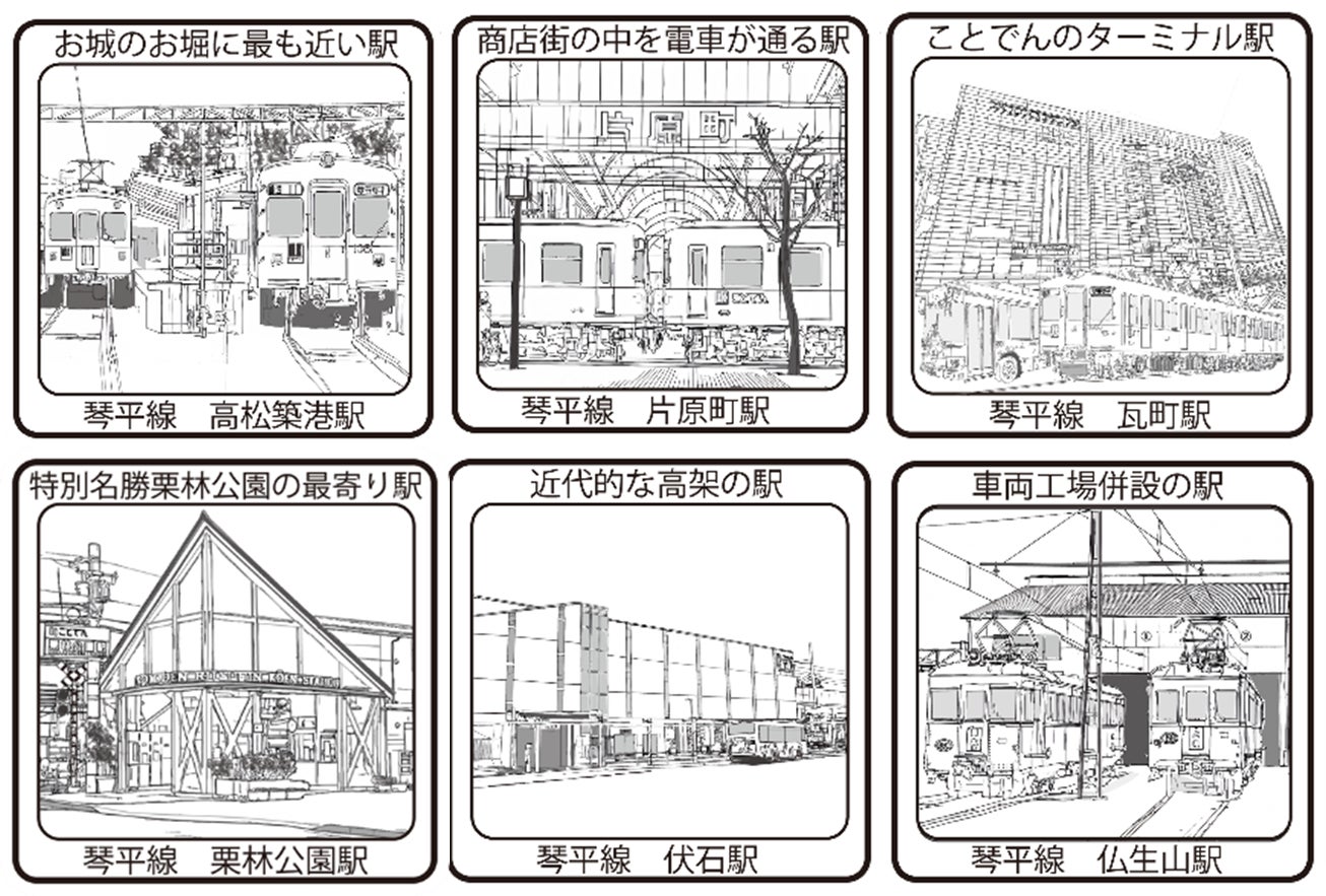 高松築港駅、片原町駅、瓦町駅、栗林公園駅、伏石駅、仏生山駅、滝宮駅、琴電琴平駅、元山駅、長尾駅、琴電屋島駅、琴電志度駅
