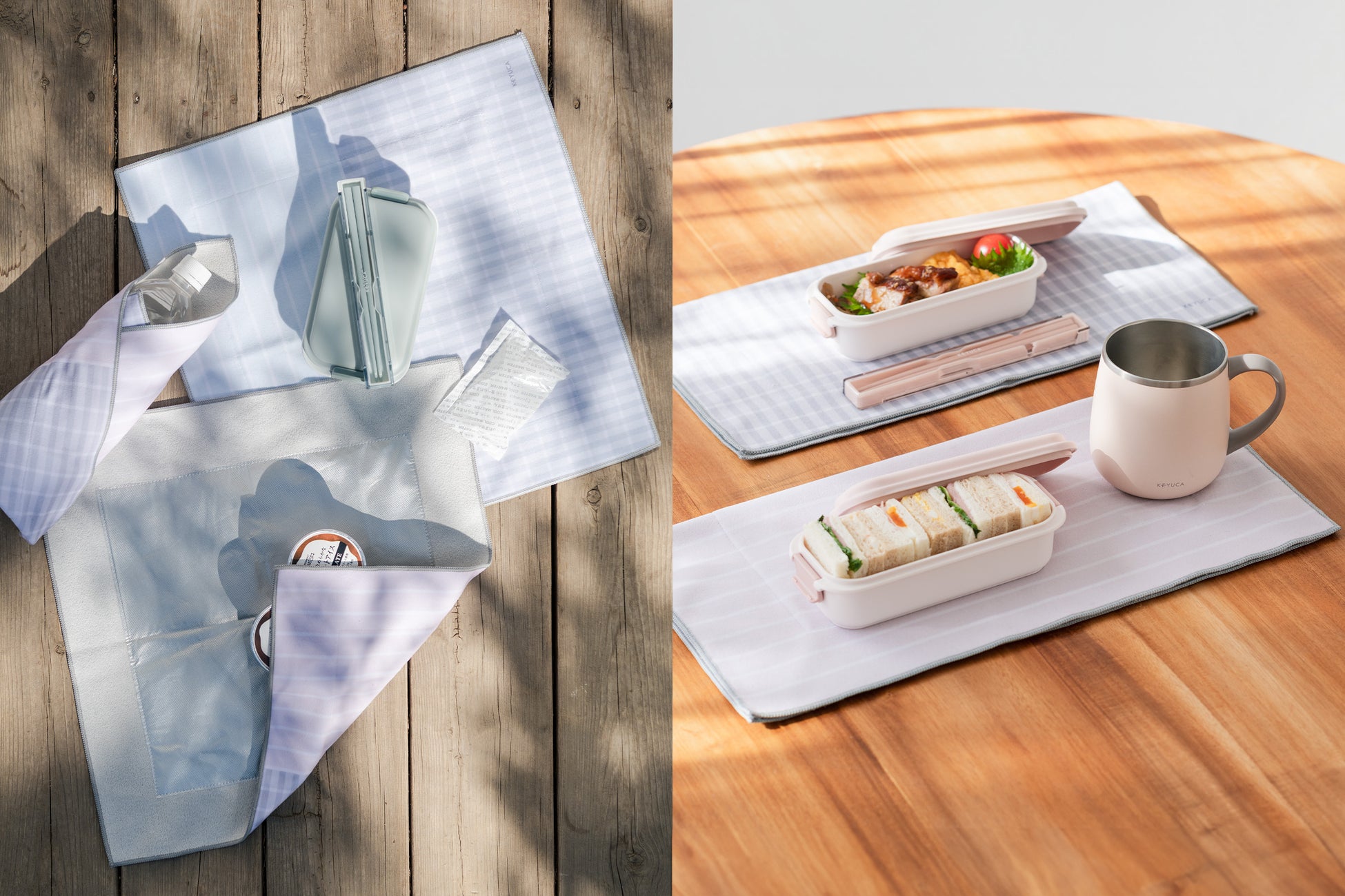 お子さんでも簡単!結ばずに、ピタッとお弁当箱を包める「巻くだけ保冷クロス」に、ランチョンマットとしても使える、1枚で2柄を楽しめる新デザインが登場