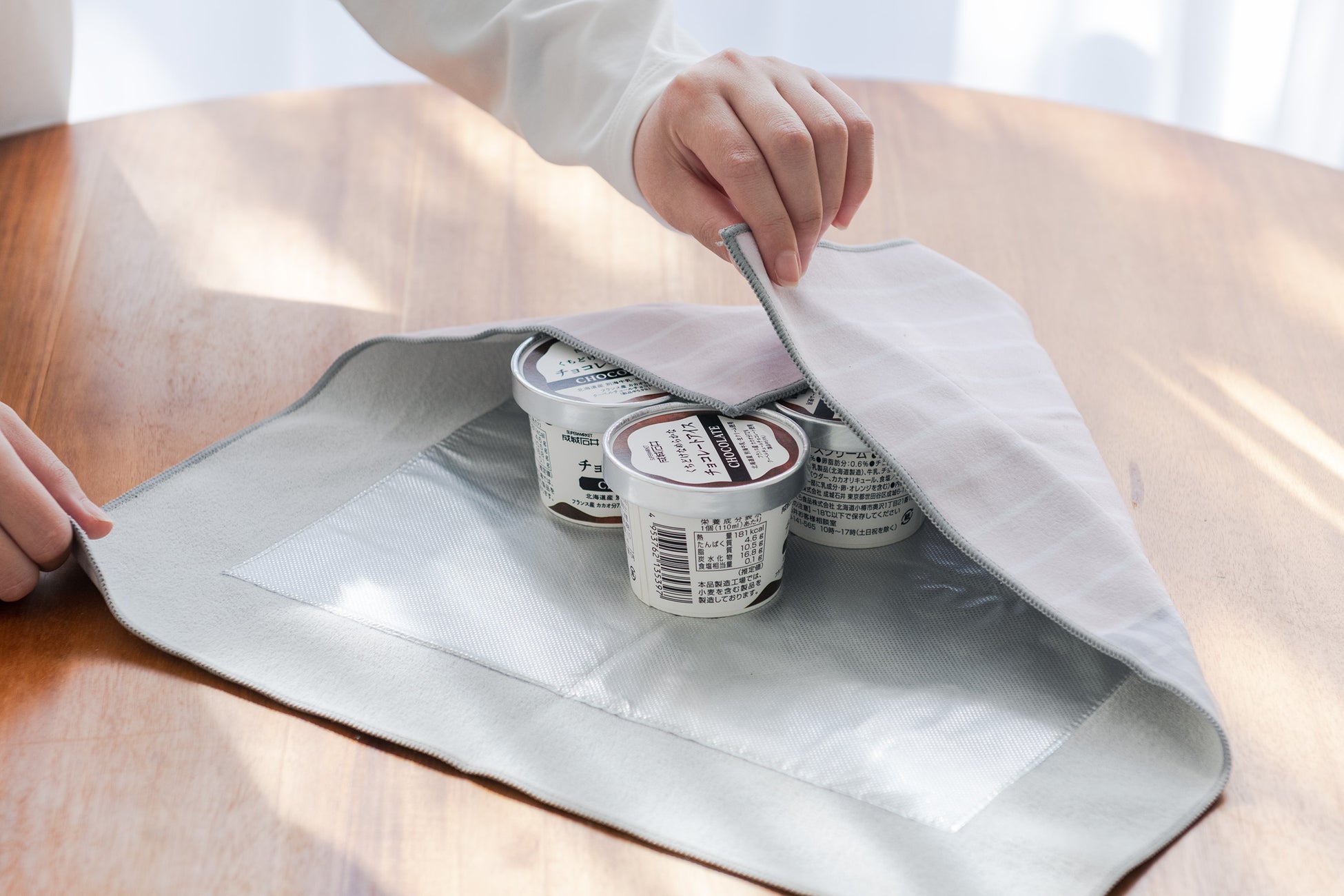 マイクロファイバーの特殊な繊維構造による、クロスの表面と裏面を重ねることでくっつく機能性を活かし、お子さんもお年寄りの方も巻くだけでピタッと簡単に包めるのが特徴です。タテ型のお弁当箱やペットボトル、おにぎり、バナナなど、物のかたちに合わせて自由自在に包むことができます。また、内側にはアルミ蒸着フィルムを縫い付けたことで、保冷剤と一緒にお弁当箱などを包めば保冷もできるため、これから暖かくなる時期に安心してお使いいただけます。更に、マイクロファイバー素材のため保冷剤やお弁当が結露しても水分を吸収してくれるのでカバンなどが濡れずにすみ、自宅で洗えるのも嬉しいポイントです。