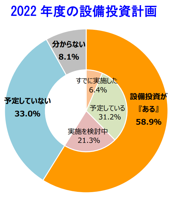 本調査結果では、2022年度に設備投資を行う予定(計画)が『ある』企業は58.9%となった。従業員数が多い企業でIT、DXなどのデジタル投資が進む一方、円安や原料高などによる先行き不透明感が設備投資のマイナス要因となった。