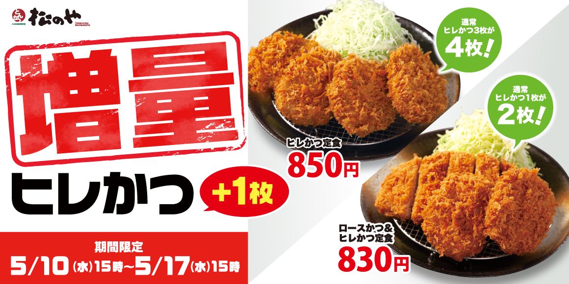 松のやの増量フェアが止まらない!食べやすく人気の根強いヒレかつが、1週間限定でお得に~2023年5月10日(水)午後3時より開催~