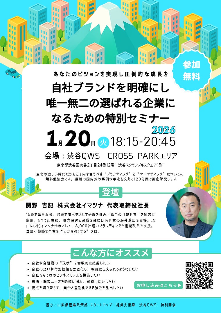 企業のブランドコンサルティング事業などを手掛ける株式会社イマジナ(本社:東京都千代田区、代表取締役社長:関野 吉記)は、2026年1月20日(火)、渋谷スクランブルスクエア(Shibuya QWS)にて、起業家・フリーランス・企業内の新規事業担当者などを対象とした特別セミナー「自社ブランドを明確にし 唯一無二の選ばれる企業になるための特別セミナー」を開催いたします。本セミナーは、山梨県産業政策部 スタートアップ・経営支援課との共催により、変化の激しい時代を生き抜くための「思考の作法」を、実践的な経営者の視点から紐解くものです。
