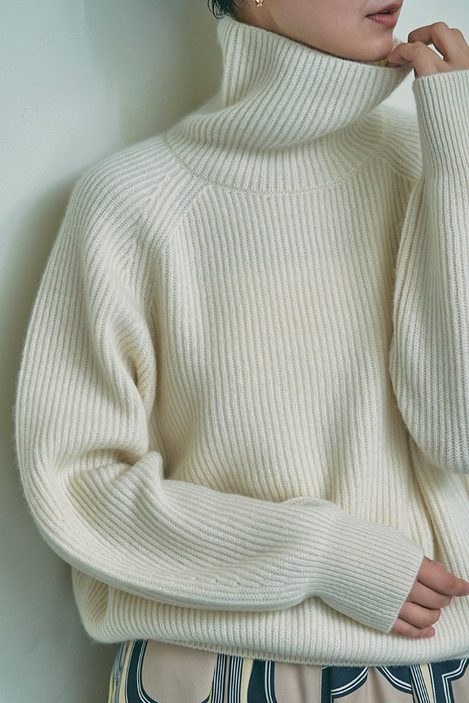 紡毛カシミヤを両畦にした立体感が特徴のニットシリーズ。