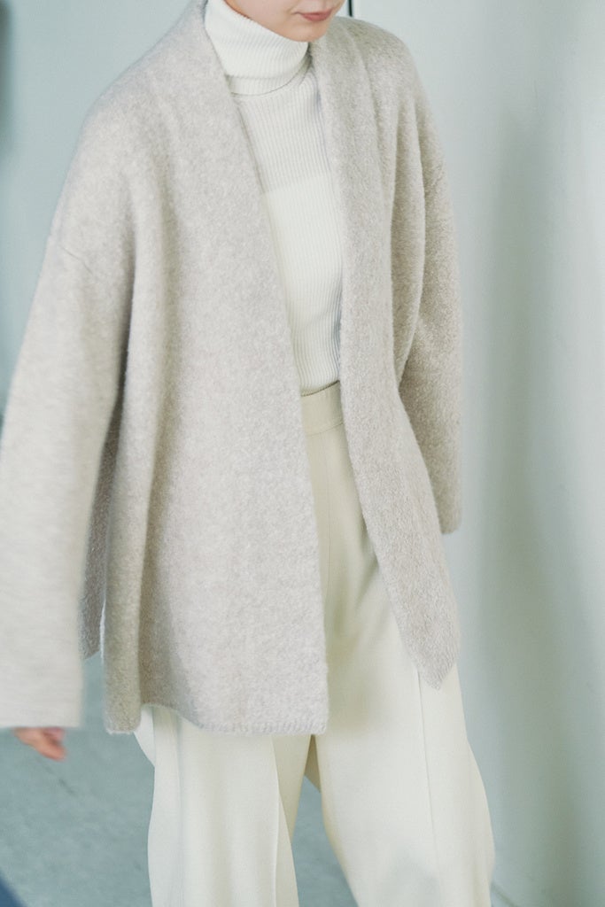 カシミヤ糸を少し緩く編む事でふんわりとした質感に仕上げたカーディガン。
