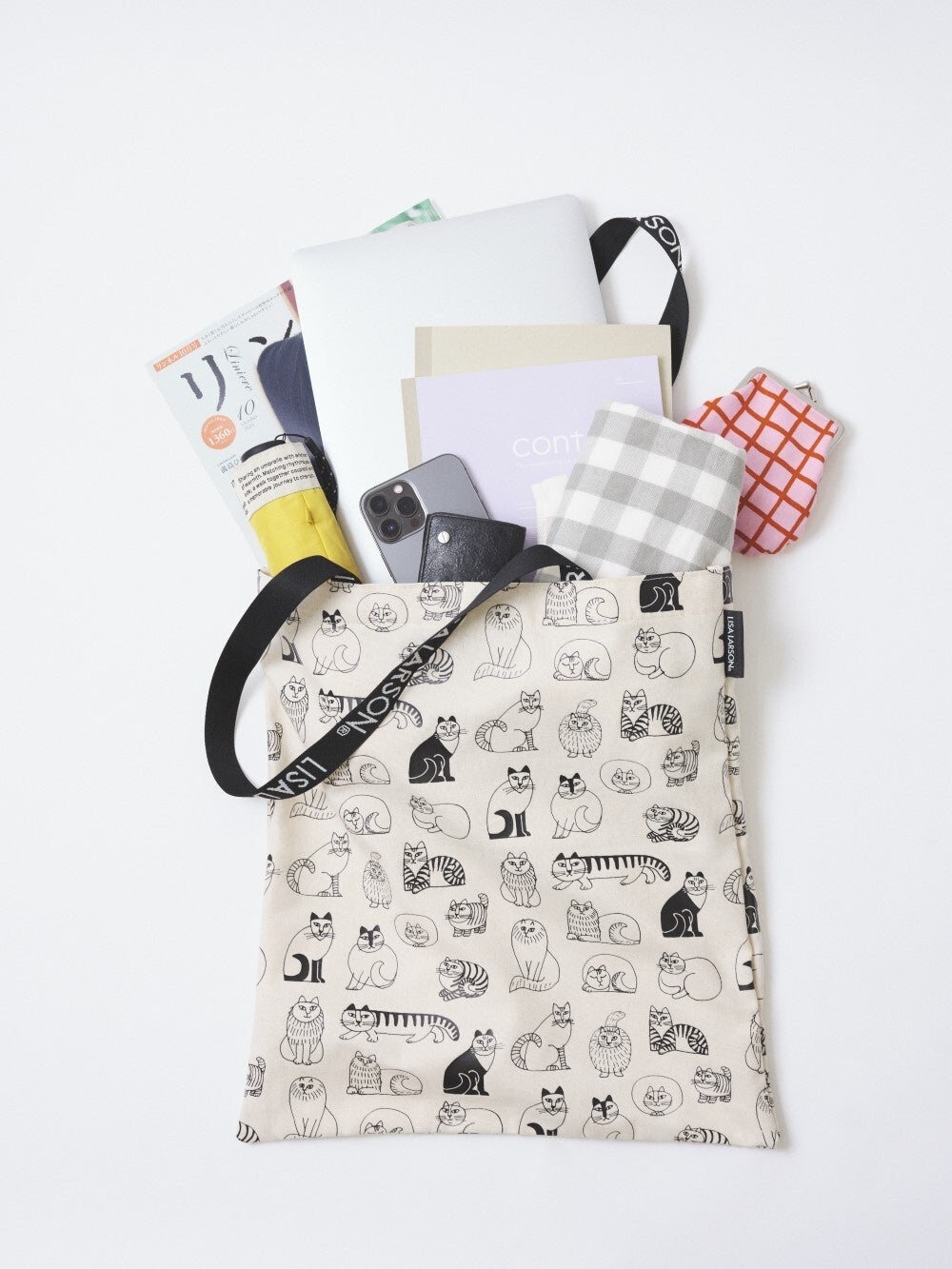 スペシャルアイテムは、リサが描いたさまざまな猫のスケッチを総柄でプリントしたトートバッグ。リサ・ラーソンの作品の中でも人気のモチーフです。内ポケットもついており、毎日のお出かけに重宝するアイテムです。