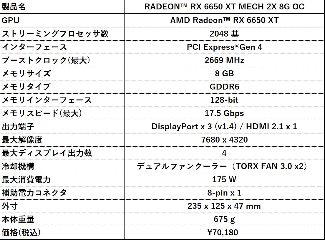 https://jp.msi.com/Graphics-Card/Radeon-RX-6650-XT-MECH-2X-8G-OC