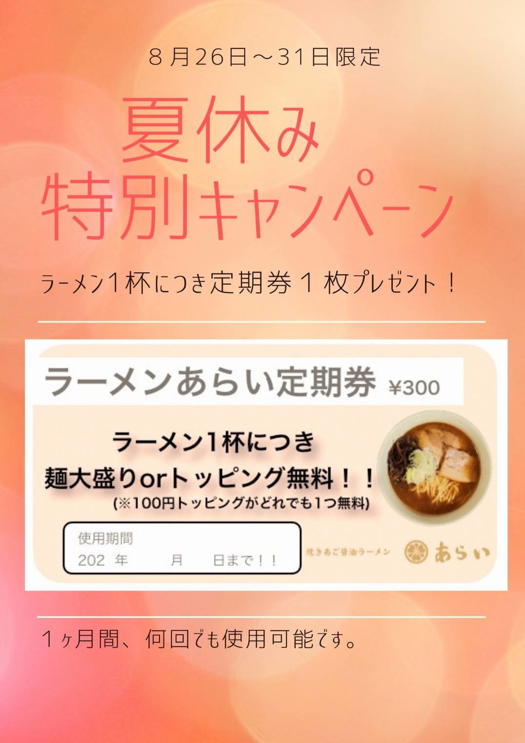 株式会社RAVIPA(代表取締役新井亨 東京都豊島区)の運営する「ラーメンあらい」では、夏休み最後のキャンペーン!大盛りやトッピングが無料になるラーメン定期券を期間限定で無料配布いたします。