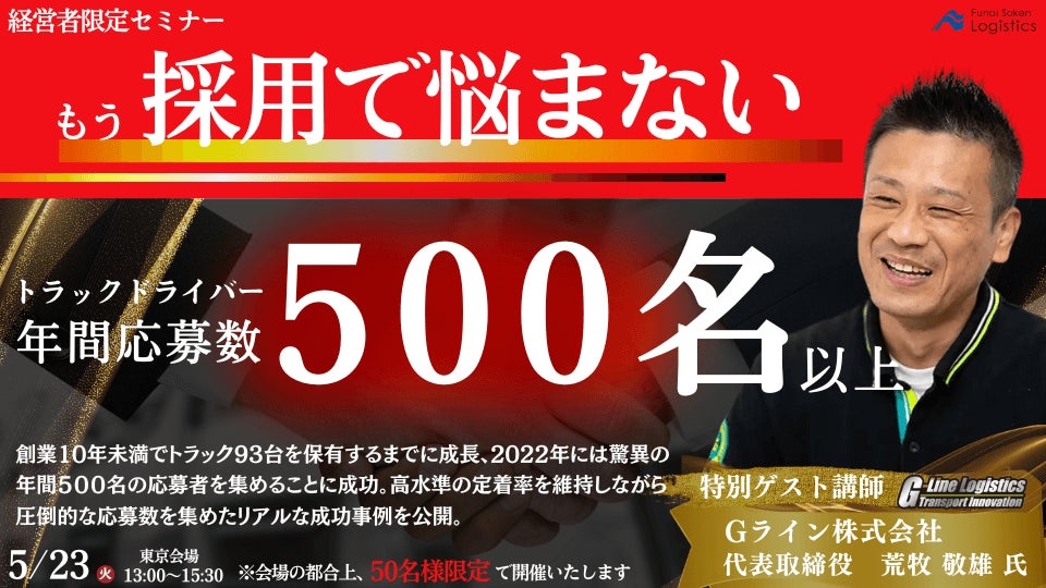 【年間500名以上の応募を集めた成功事例を公開】シン・ドライバー採用セミナーを2023年5月23日(火)に開催|物流コンサルの船井総研ロジ