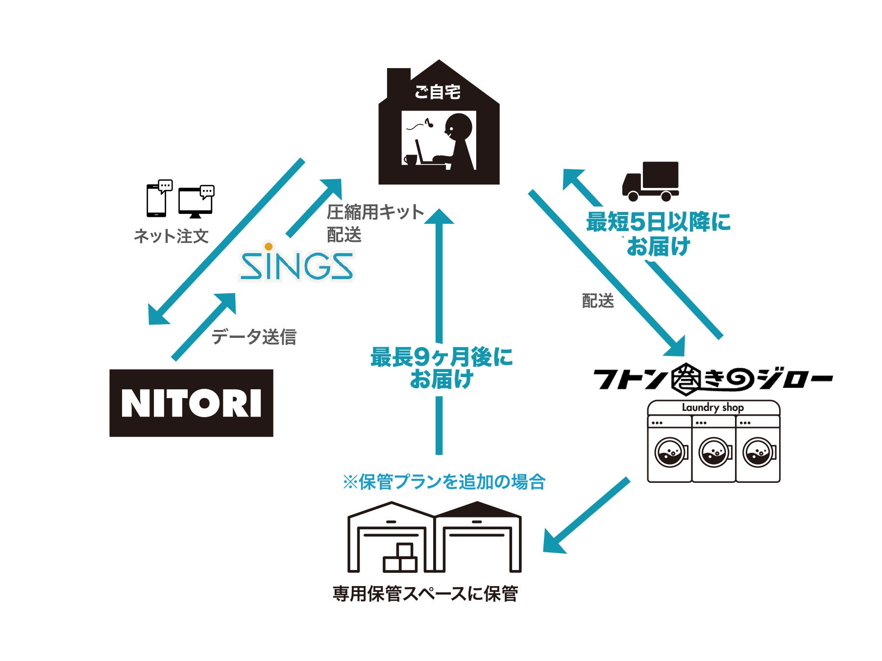 ➃フトン巻きのジロー株式会社、SINGS株式会社と共同でニトリネットから提供する、ご自宅に居ながら布団類のクリーニングと長期保管サービスを受けられる(※2)「保管付き布団洗いサービス」