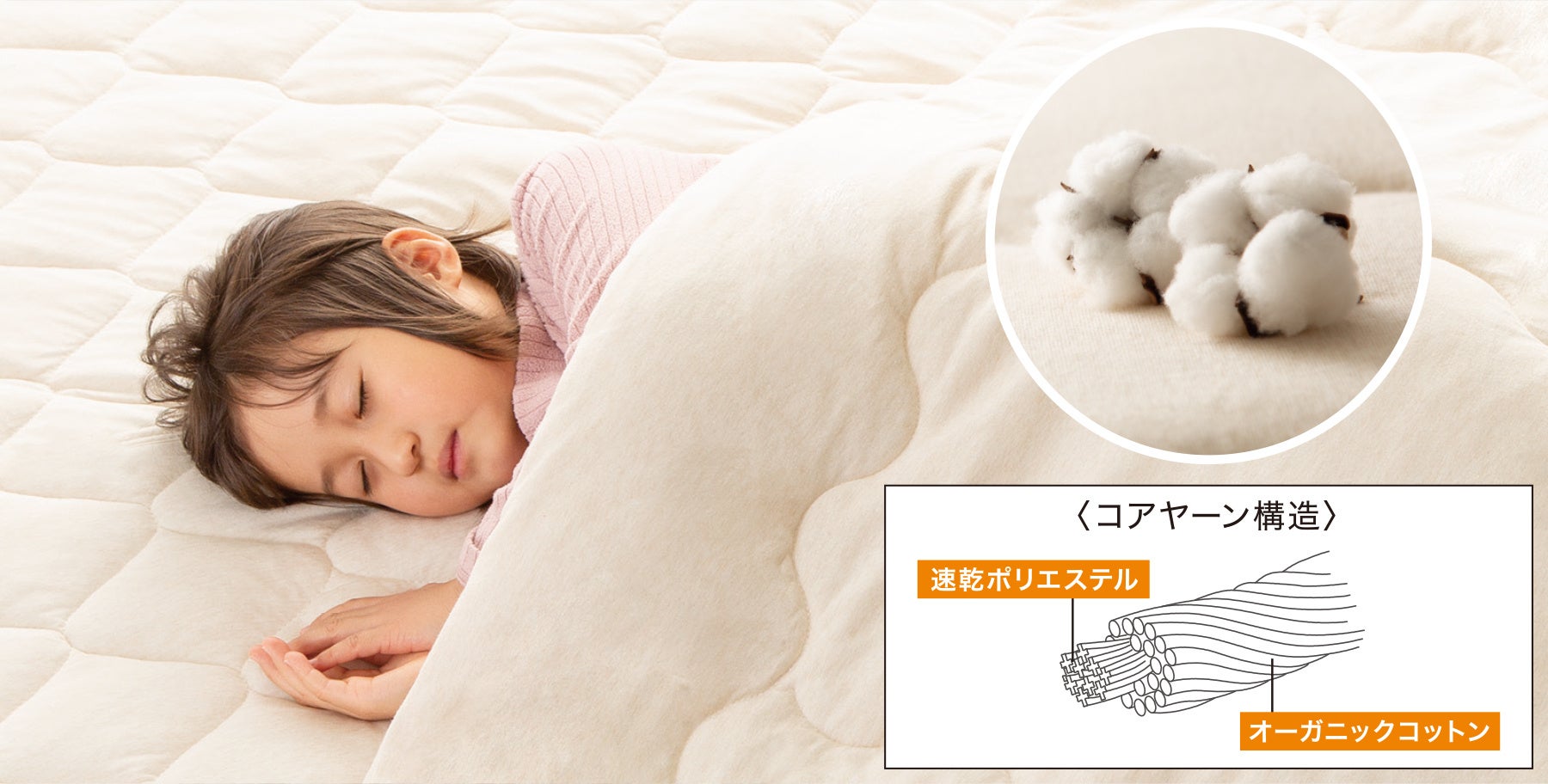 芯糸のポリエステルにオーガニックコットンを巻き付けるコアヤーンを採用した、ハイブリッドオーガニックコットン寝具。この構造により、オーガニックコットン100%の従来品と比較して約2倍の速乾性を実現した。コットンならではの柔らかな肌触りを残しつつも、乾きやすさをプラスし、洗濯時間の短縮を通じて家事負担の軽減に貢献する。