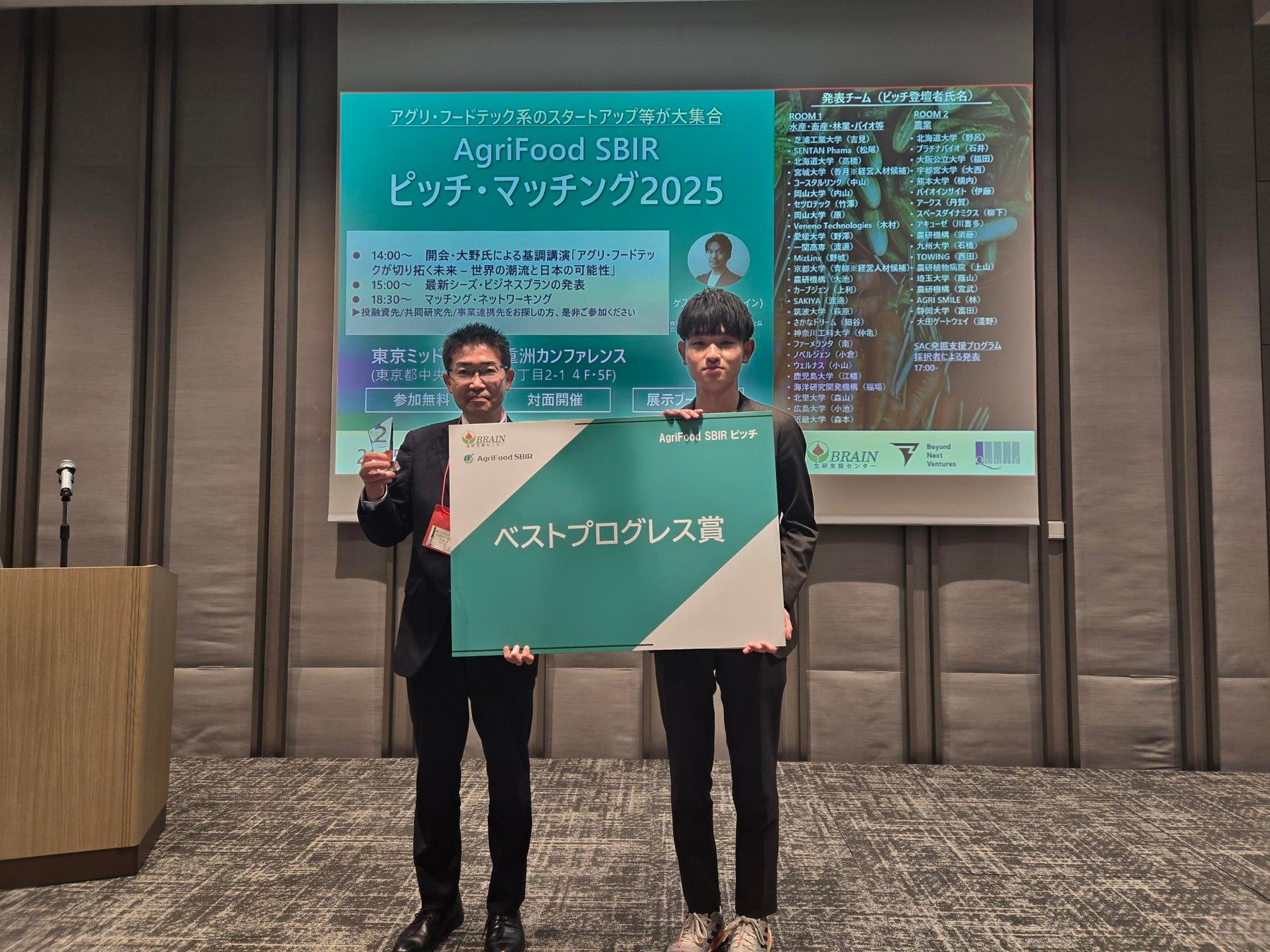 また、令和7年3月17日に東京ミッドタウンで開催された「AgriFood SBIR ピッチ・マッチング2025」において、渡邊教授が「温暖化から地球と生物を守る」複合的環境ビジネスの研究開発成果および事業構想等を発表し、その取り組みが高く評価され、優秀研究課題の1つとして「ベストプログレス賞」を受賞しました。(全7チームが受賞対象)
