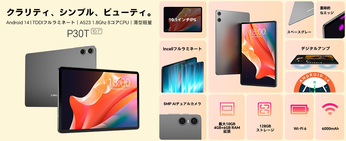 Teclast P30Tの10.1インチIPSディスプレイは、広視野角と1280×800の高解像度を備え、鮮やかでクリアな視覚体験を提供します。軽量(450g)で耐久性のあるメタルボディは、8mmのベゼルで持ちやすく設計されています。オクタコアA55を搭載したAllwinner A523プロセッサーは、高いパフォーマンスとAI能力を発揮し、4GBのLPDDR4X RAMは最大10GBまで拡張可能です。最大1TBのMicro SDカード対応により、ストレージも十分です。