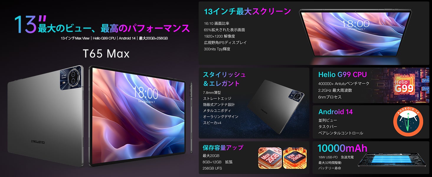 T65Maxは、洗練されたユニボディデザインとAura Ring設計を採用し、デュアルカメラを統合。8MPのOmniVisionフロントカメラと13MPのメインカメラを搭載し、クリアなビデオ通話や美しい写真撮影を楽しめます。10000mAhのバッテリーは長時間の使用をサポートし、18Wの急速充電に対応しています。TDD+FDDデュアルモード4G LTEネットワークアクセスをサポートし、最大600Mbpsの高速インターネット接続が可能です。