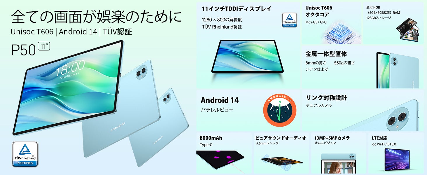 Teclast P50は、11インチの広視野角IPSディスプレイを搭載し、1280x800の解像度で鮮やかな視覚体験を提供します。T-Colour 3.0技術により、色彩がよりリアルで豊かに再現され、TDDIとインセルタッチスクリーン技術でスムーズな操作性を実現します。TÜV SÜDブルーライト認証を取得しており、目の保護を確保しながら、どんな環境でも安心して使用できます。