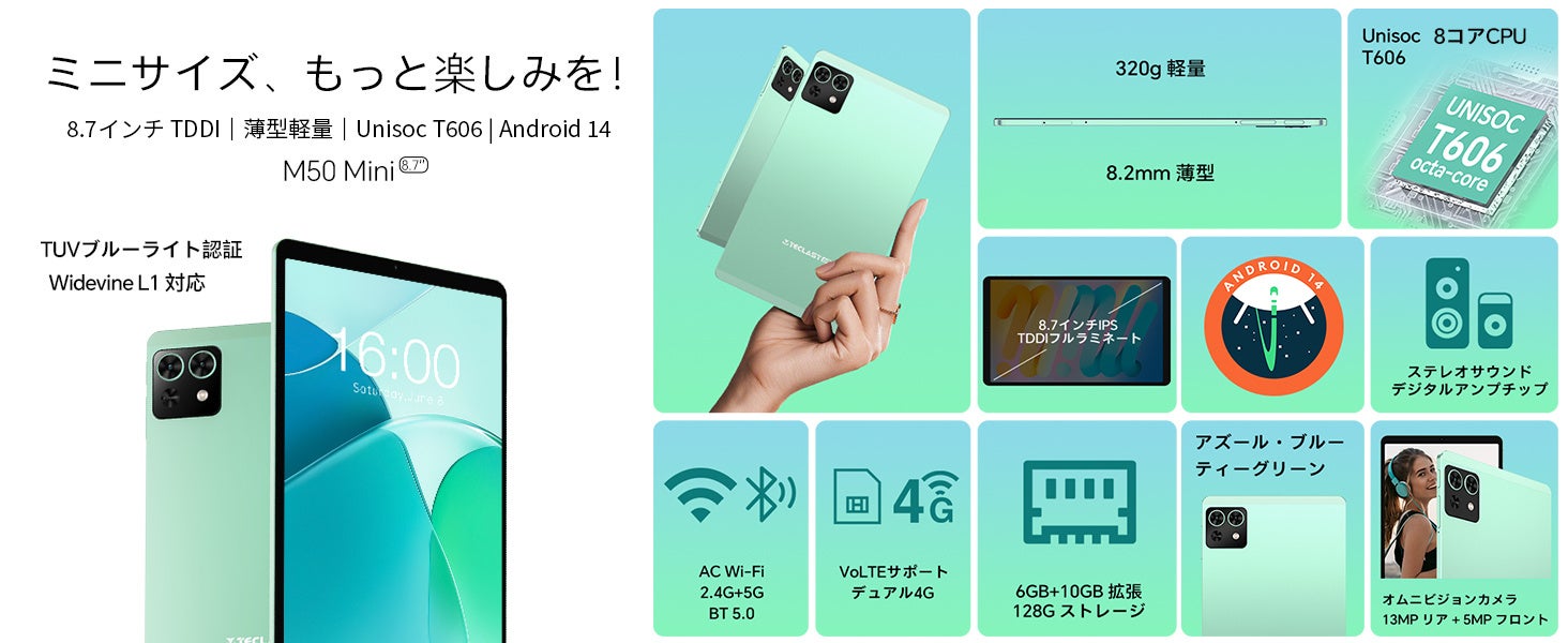 Teclast M50 Miniの8.7インチIPSディスプレイは、広視野角と1340x800のHD解像度で、クリアで快適な視覚体験を提供します。Teclast T-Colour技術により自然な色彩を実現し、TDDIタッチスクリーン技術でスムーズな操作が可能です。アズールブルーのメタルサンドブラスト仕上げと345gの軽量設計が特徴です。Unisoc T606オクタコアプロセッサーは、高性能A75コア2つと効率的なA55コア6つで構成され、高いパフォーマンスを発揮します。Mali-G57グラフィックスプロセッサは、ゲームや動画編集に最適で、30%-60%の性能向上を実現します。6GBのLPDDR4X RAMは、8GBの仮想メモリ拡張で最大14GBまで拡張可能で、128GBの高速ストレージは最大1TBまで拡張可能です。