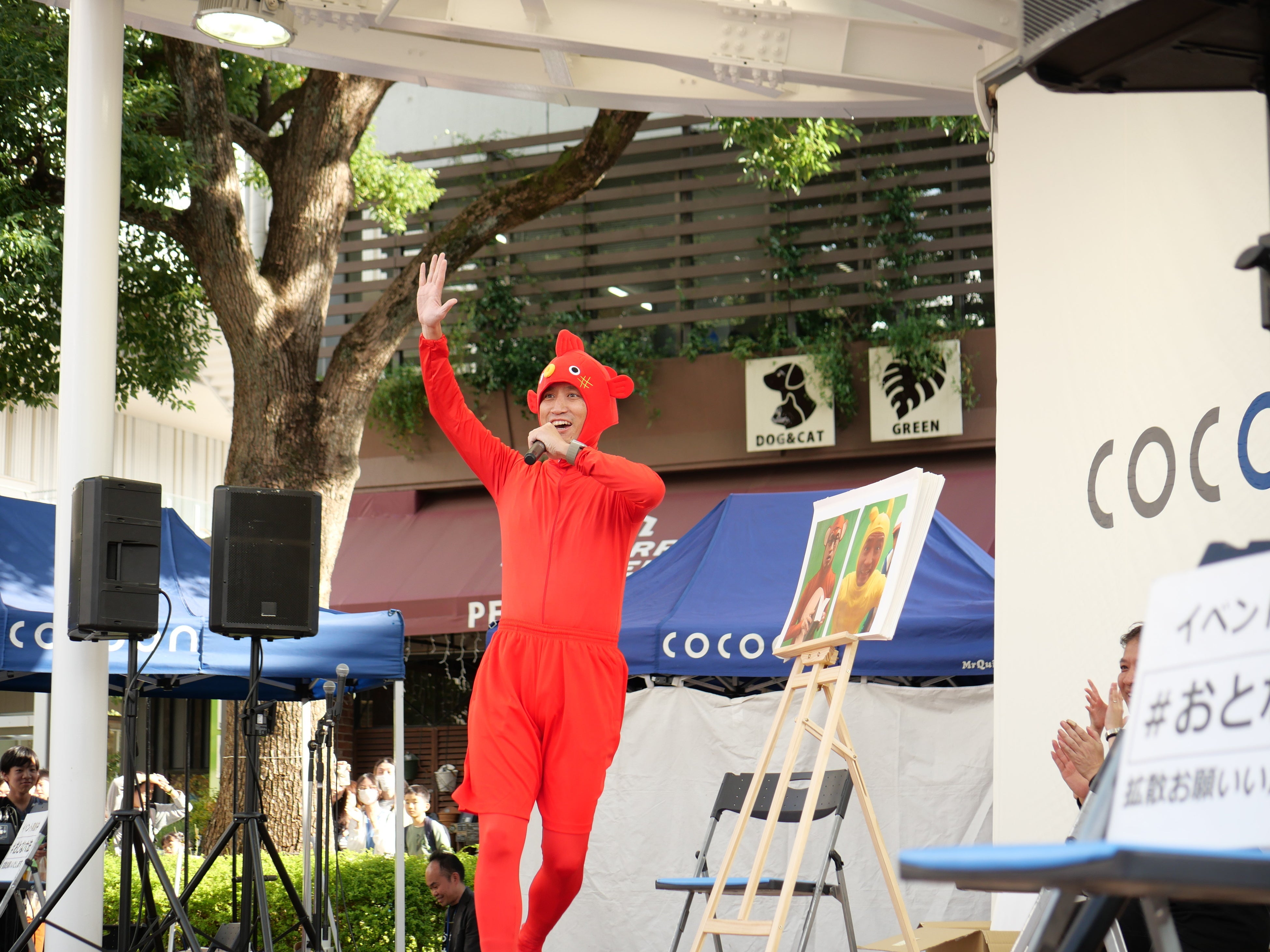 岡野タケシ弁護士の動画での相棒「のりちゃん」が登場し、子供たちの大きな歓声とともにスタートした本イべント。のりちゃんと大観衆の呼び声に応えて、動画にもごくたまに登場する超レア人気キャラクター「タケ金魚」の衣装でステージに現れた岡野タケシ弁護士。思わぬ姿での登場に、ここでもファンの大歓声が起こりました。「のりちゃん」は挨拶とともにリアルの場でファンたちに会える喜びを伝えました。