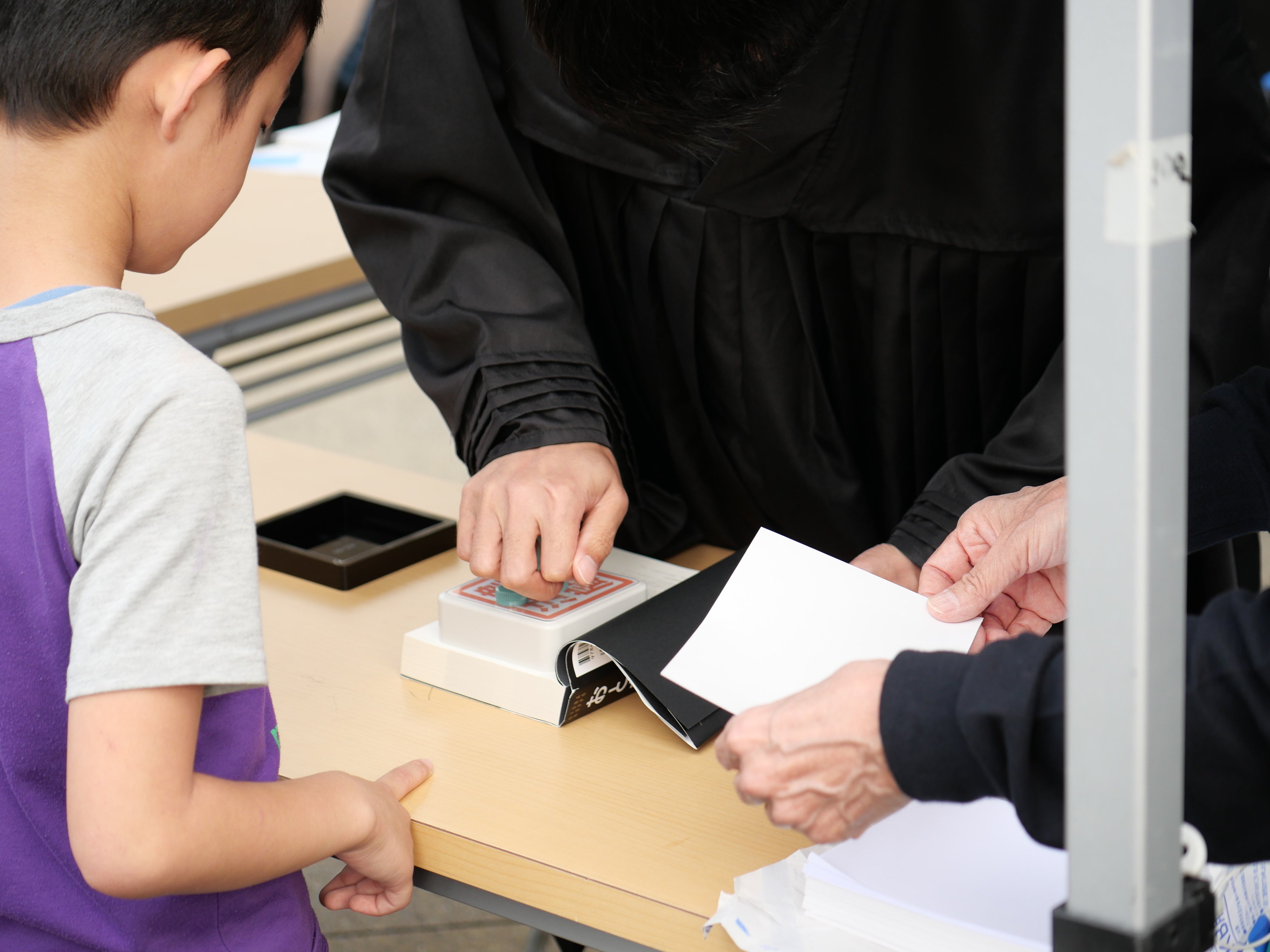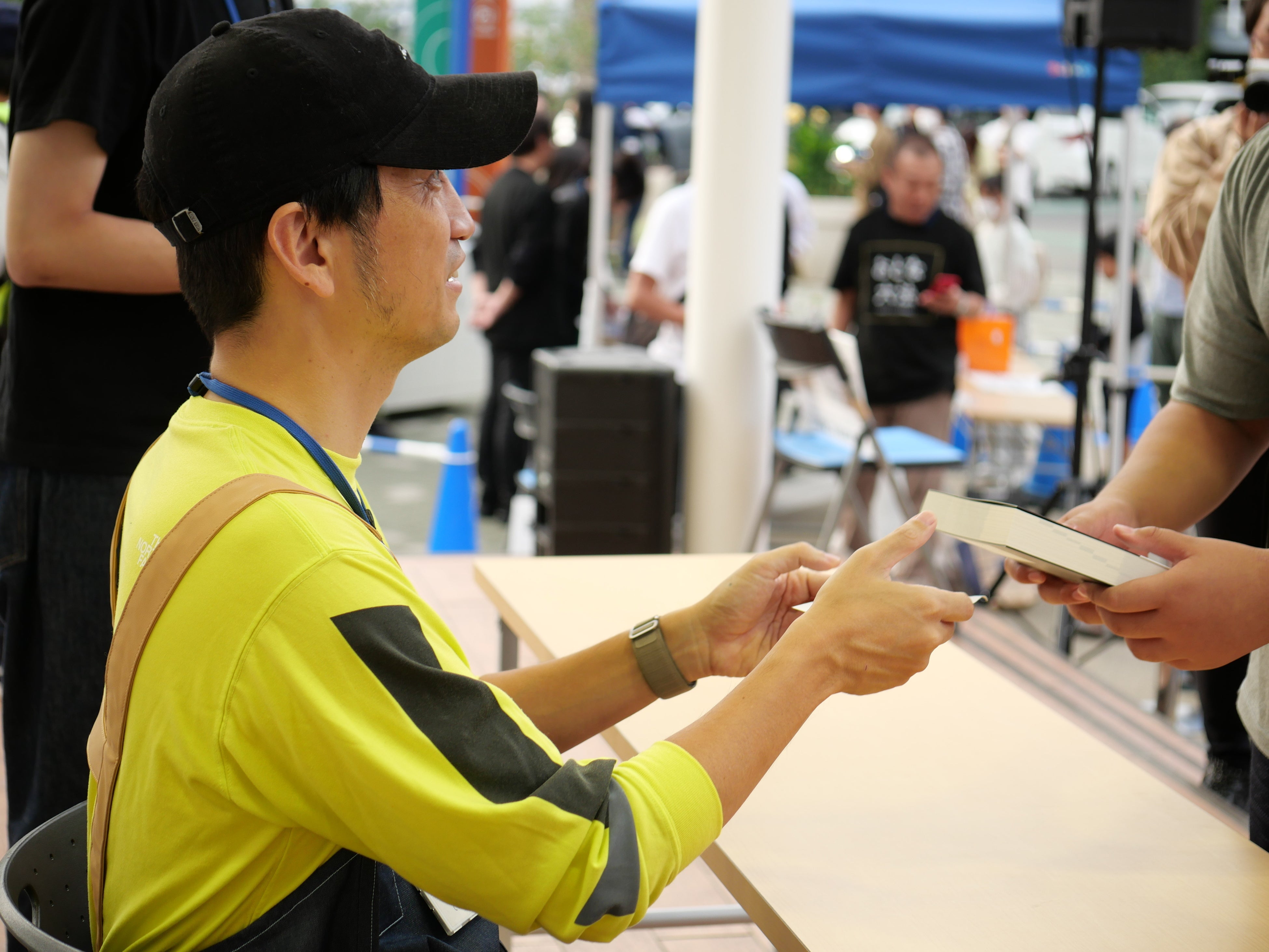 また、当日、書籍を購入していただいた方や、すでに購入した本を持ってきていただいた方には、特典として動画の中で頻繁に登場する合言葉「法律厳守」のスタンプを押印するスタンプ会を実施し、ここにも親子連れを中心に700組近くの方々が参加。その列は最長150メートル以上に及びました。