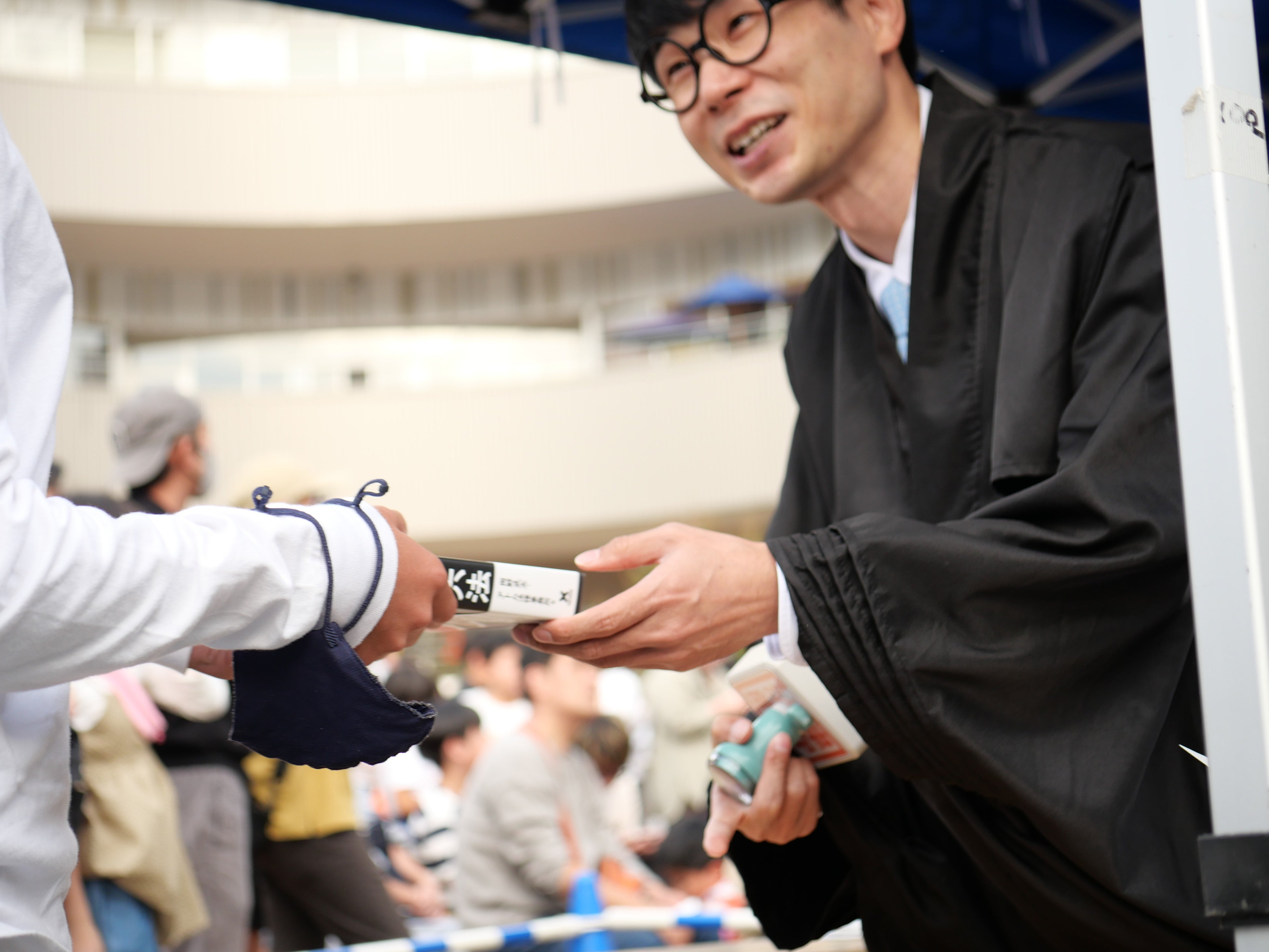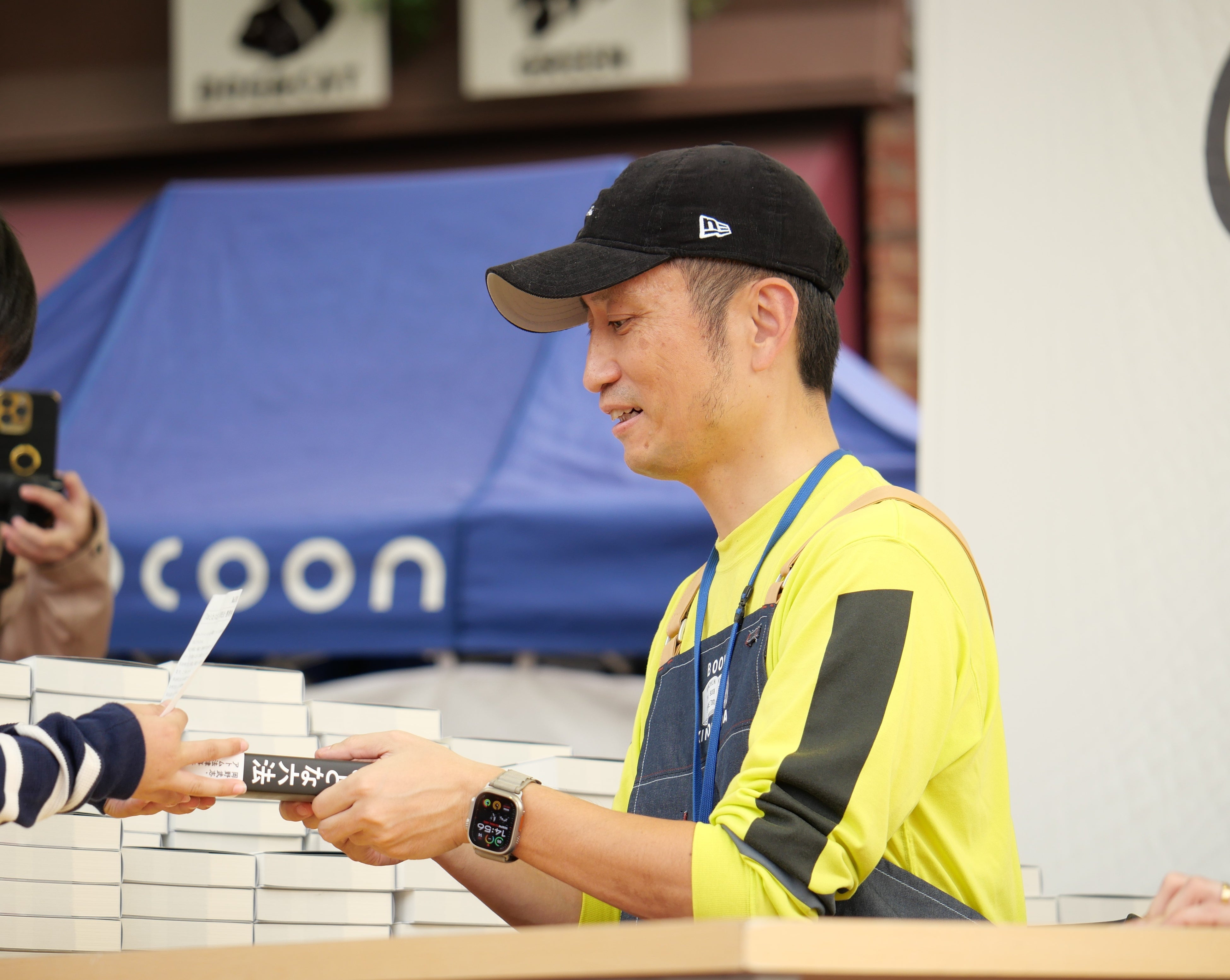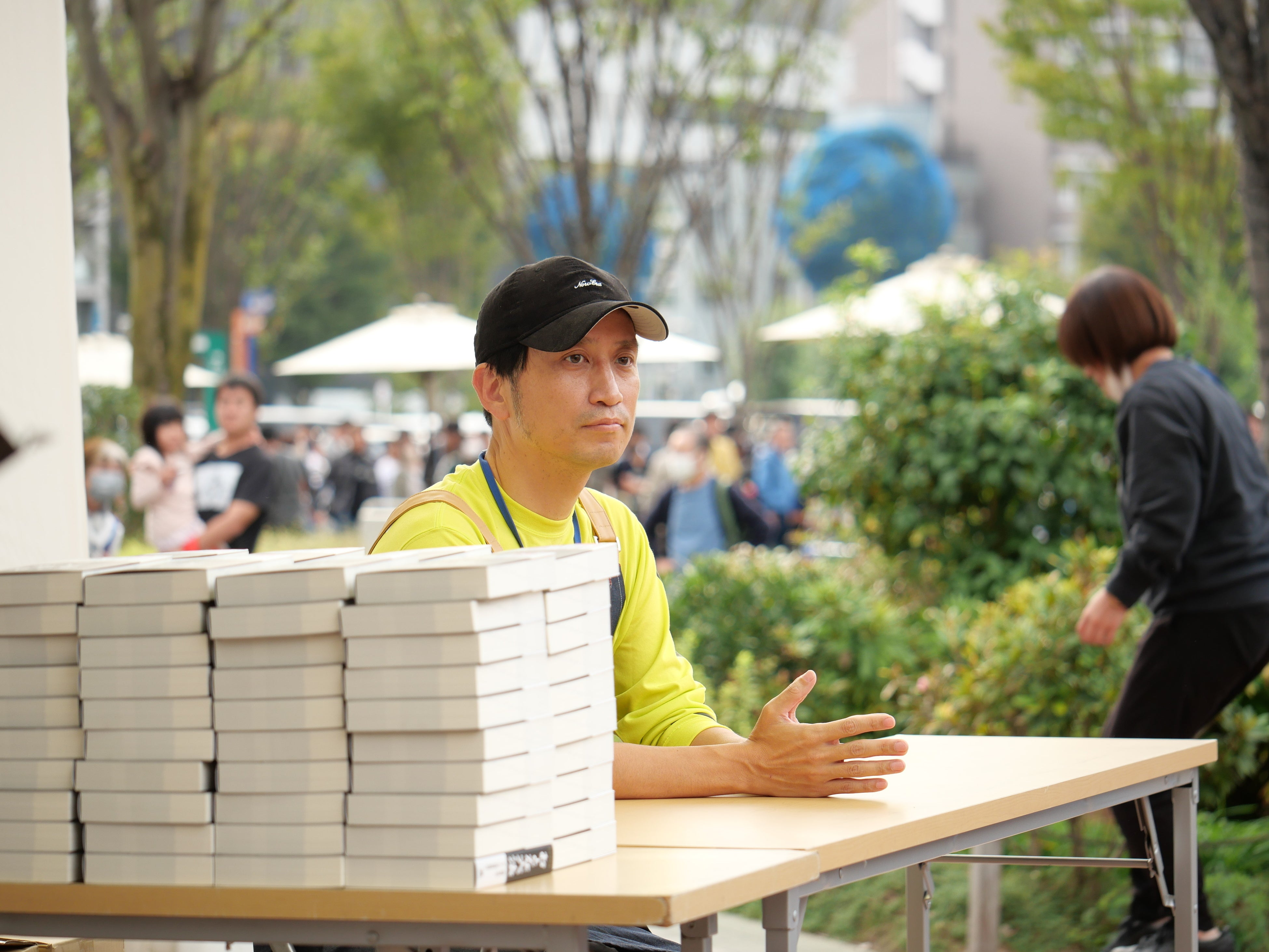 トークを終えた岡野タケシ弁護士は舞台裏に戻り、書店員に扮した姿で再登場。これを合図に、トークショーに続く『おとな六法』の即売会がスタートし、岡野タケシ弁護士がファンの皆さんに直接本をお渡ししました。