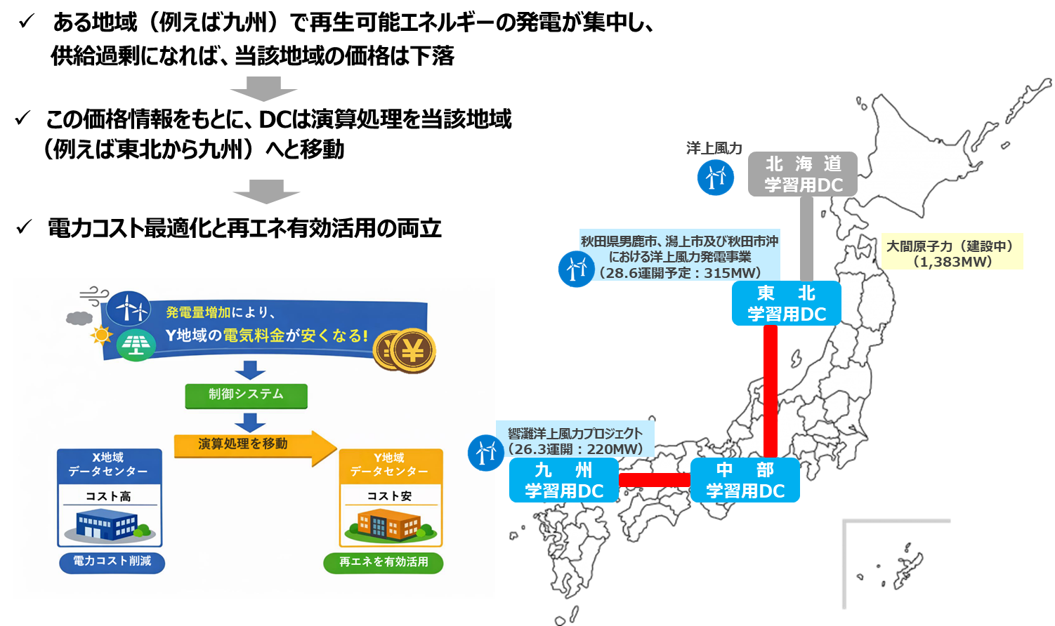 一方、DCにおける計算需要及び電力需要は急速に拡大しており、電力システムへの影響も大きくなっています。また、脱炭素化の進展により太陽光や風力等の自然変動電源の導入が進む中、特定の地域や時間帯において出力抑制*5が発生するケースも増加しています。