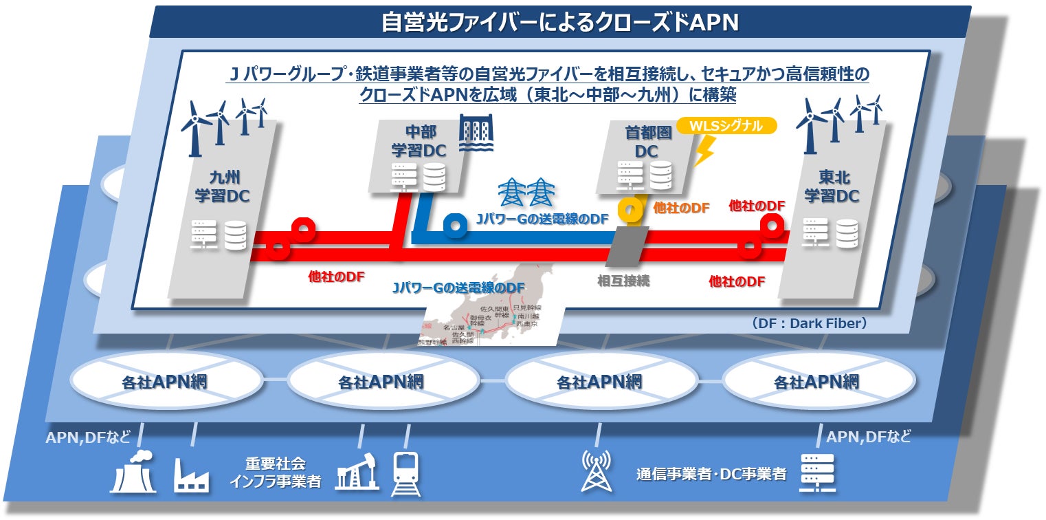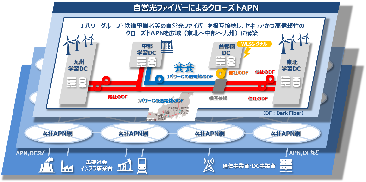本検討では、地方分散型のデータセンター(以下、DC)を電力システムの安定化・効率化に貢献する強みとして生かす、新たな運用モデルの確立をめざします。具体的には、Jパワーグループ、JR各社及び私鉄各社等の鉄道事業者が保有する未使用の光ファイバー回線(ダークファイバー/以下、DF)を用いて全国を縦断するセキュアな自営APN網を構築します。さらに、WLS技術を組み合わせることで、分散立地する複数のAI-DCを連携・協調運用し、あたかも一つの大規模DCのように運用することをめざします。