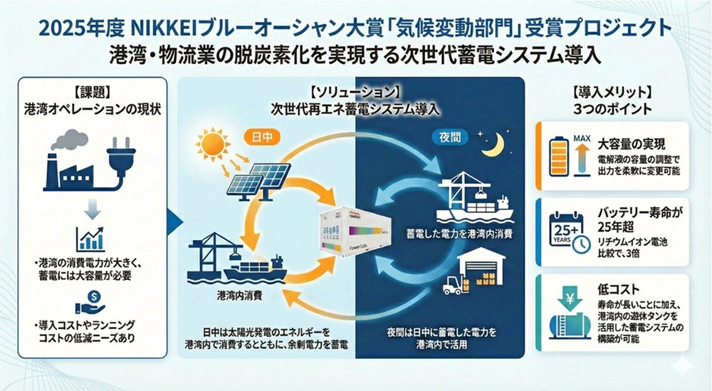 株式会社商船三井(社長:橋本 剛、本社:東京都港区、以下「当社」)の100%子会社CVC(コーポレートベンチャーキャピタル)である株式会社MOL PLUS(代表:阪本 拓也、本社:東京都港区、以下「MOL PLUS」)は、2025年度NIKKEIブルーオーシャン大賞(註1)の「気候変動部門」をグループとして初めて受賞しました。本賞は、気候変動対策の具体的な取り組みを表彰するもので、MOL PLUSはシンガポールに本社を置く投資先スタートアップ企業VFlowTech(読み:ブイフローテック 註2)社と取り組んでいる「港湾・物流業の脱炭素化を実現する次世代蓄電システム導入プロジェクト」(以下「本プロジェクト」註3)により受賞しました。