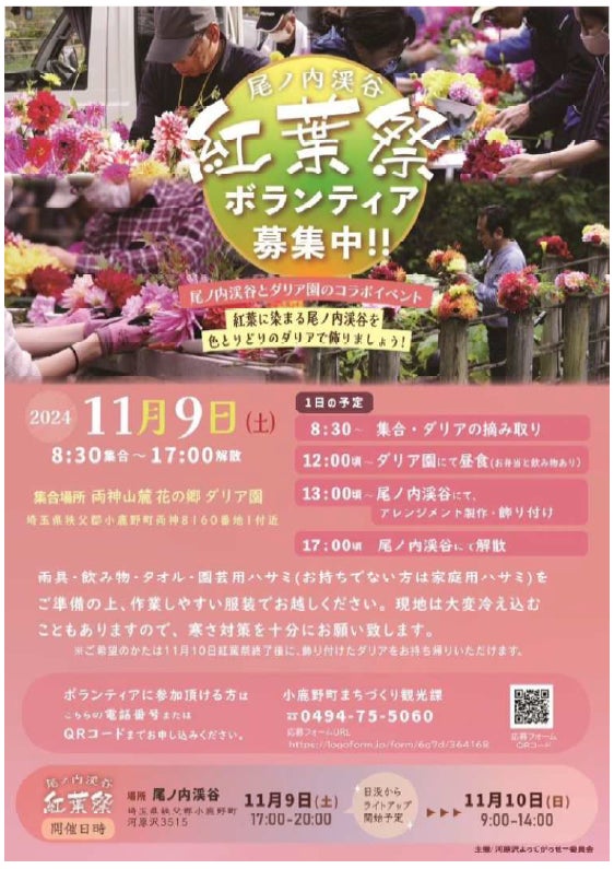 今回は、小鹿野町の尾ノ内渓谷紅葉祭ボランティアの参加者を募集します。尾ノ内渓谷紅葉祭に向けて、摘み取ったダリアを吊り橋に飾り、滝の周りに敷き詰め、紅葉で色づく渓谷を彩ります。