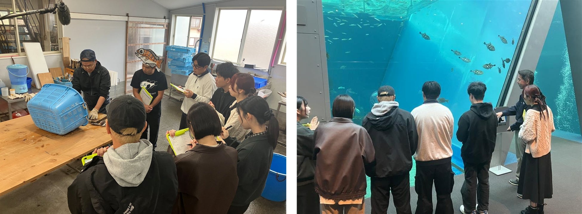 さらに、「上野台豊商店」では、常磐ものを活かした定食をいただき、カナガシラのフライが入ったソースカツ丼などを通して、学生たちは自らが学んできた魚種の味を実際に体験しました。事前学習で得た知識と「食」を結びつけることで理解がより深まり、福島の海の恵みと魅力を実感する貴重な機会となりました。最後に訪れた「アクアマリンふくしま」では、展示を通じて福島の海の生態系や多様性について理解を深め、自然環境の大切さを改めて認識しました。