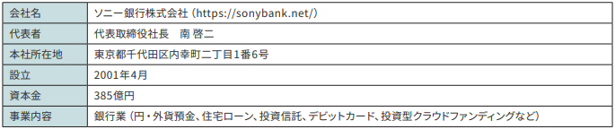 ソニー銀行はインターネットを活用した個人のための資産運用銀行です。2001年に開業し、今年20周年を迎えました。「フェアである」ことを企業理念に掲げ、円預金、外貨預金、投資信託、住宅ローン、Visaデビット付きキャッシュカード Sony Bank WALLET などさまざまな金融商品・サービスを提供しています。