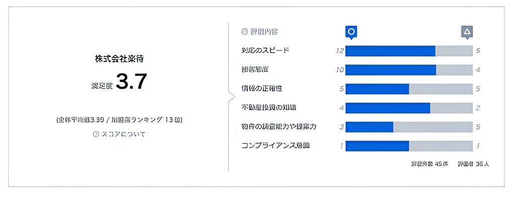 楽待では、不誠実な顧客対応をする不動産会社を減らすため、不動産投資家が不動産会社の接客や商談内容を評価する機能を設けています。顧客満足度の平均点は3.9点(5点満点)となっており、顧客満足度が2.5点以下と低い会社については、当社のカスタマーサポートから直接指導を行っています。2024年1月現在、不動産投資家から寄せられた不動産会社の評価数は累計で15万件以上になり、評価された不動産会社は5500社超にのぼります。