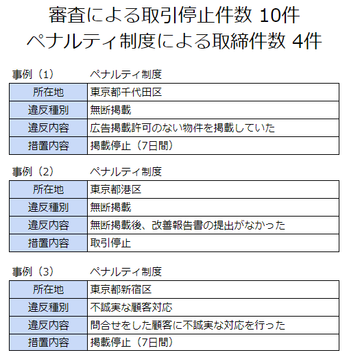 前半期に比べ取引停止件数は増加、ペナルティ制度の取締件数は減少