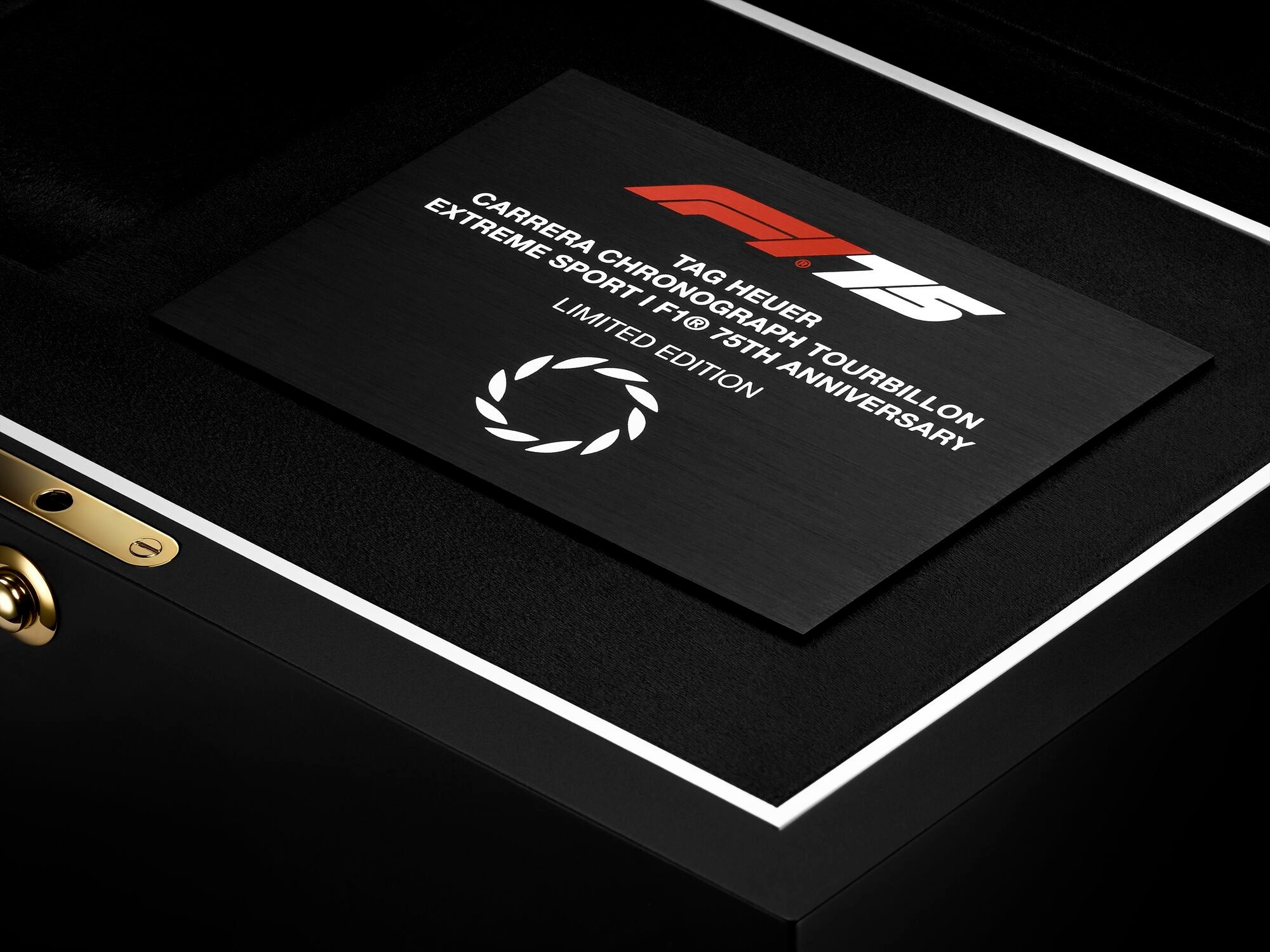 このタイムピースは、公式F1® 75周年記念ロゴ、タグ・ホイヤー ロゴ、勝利の冠をあしらった、ブラックの特製プレゼンテーションボックスに収められています。各モデルのケースバックには、F1®チャンピオンシップのいずれかの年が刻印され、それぞれが独自のストーリーを持つ一本として仕上げられています。ケースからダイヤル、ストラップ、ムーブメントの隅々に至るまで、タグ・ホイヤーの精度と性能への揺るぎないこだわりが息づいています。
