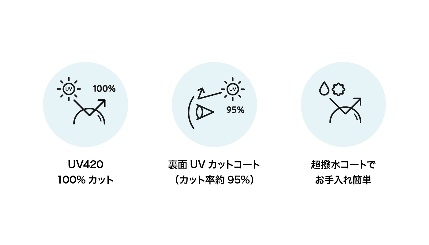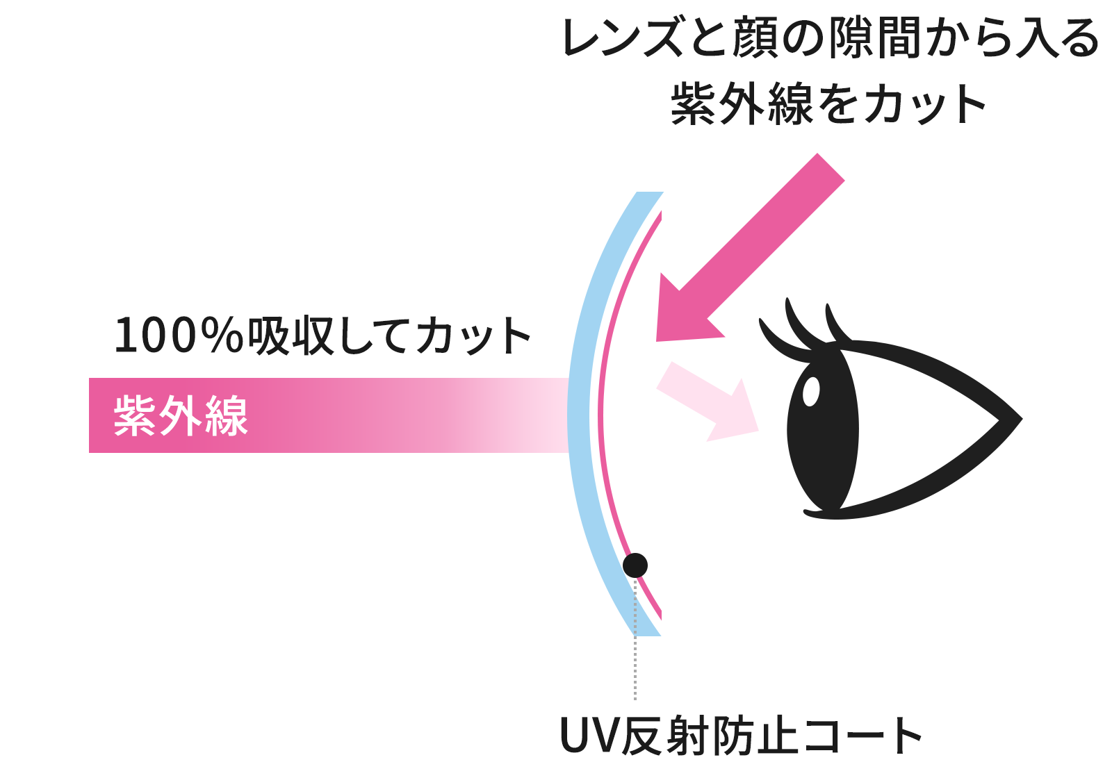 また、レンズは紫外線のみならず、420nm(ナノメートル)までの有害光もカットするUV420の高機能レンズを搭載。通常紫外線の多くはレンズの前面に当たりますが、上から降り注ぐ紫外線の一部は、レンズの裏面に反射して目に入ってしまう可能性がありました。Zoff UVクリアレンズは、裏面にUV反射防止コートを施すことで、この反射光もしっかりカット。あらゆる方向の紫外線から目を守ります。