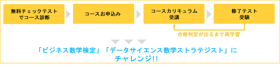 最初に専用サイト(https://surala.jp/service/service_other/suken/)から無料チェックテストでコース診断を受けていただきます。自分のレベルに合ったコースがわかった後お申込みいただきます。コースごとのカリキュラムに沿って学習を進め、最後に修了テストを受験します。修了テストの合格判定が出るまで何度でも繰り返し学習することができます。合格判定が出たら、「ビジネス数学検定」「データサイエンス数学ストラテジスト」にチャレンジしてください(※)。