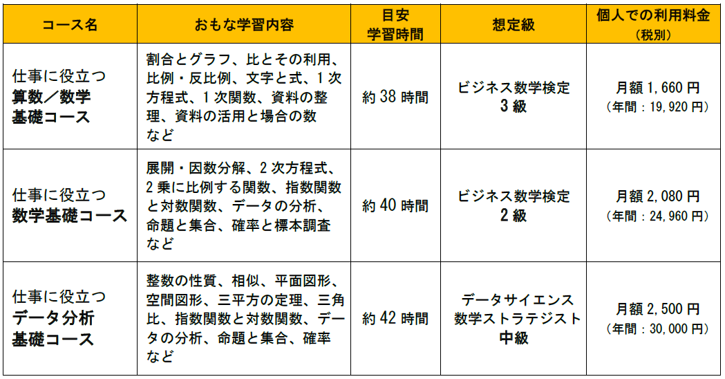 このたびリリースする「仕事に役立つ数学基礎コース」は、公益財団法人日本数学検定協会が実施・運営する「ビジネス数学検定」の3級および2級、「データサイエンス数学ストラテジスト中級」の基礎となる算数・数学の学習ができる設計となっています。義務教育課程の算数からデータサイエンティストの入門レベルまでの数学を習得できるので、学生から社会人まで幅広いニーズに対応が可能です。